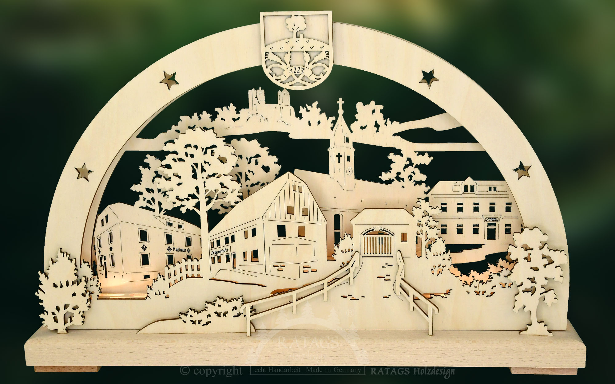 RATAGS Kunsthandwerk hat aus Anlass des 800. Geburtstages von Langenwolmsdorf einen Schwibbogen entwickelt, der dieses Jubiläum in Holz für die Nachwelt festhält. Zu sehen sind markante Bauwerke von Langenwolmsdorf, wie die alte Schule, die Kirche, das ehemalige Rathaus, das Erbgericht oder das Tor zum Friedhof. In der Ferne thront die Burg Stolpen, gekrönt vom Wappen von Langenwolmsdorf.