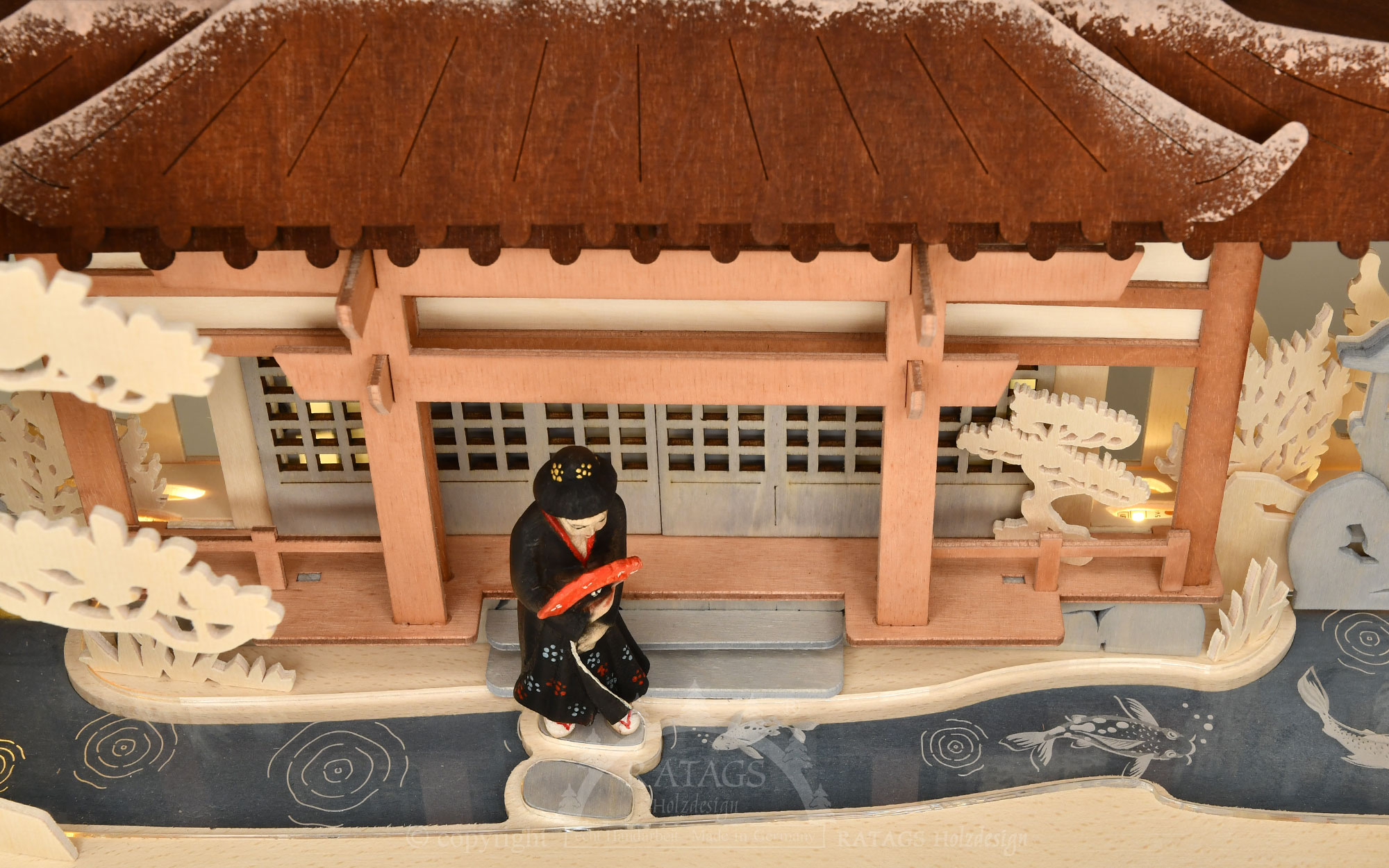 Dieser Schwibbogen der Superlative mit dem Flair des fernen Ostens verwendet nicht nur zusätzlich ein neues Material für die Wasseroberfläche, das Acrylglas, er bietet auch mit dem Öffnen der Fensterläden eine Zusatzfunktion, die einen weiteren Effekt freigibt, nämlich das Schattenspiel. Im nun geöffneten Fenster lässt sich die Silhouette ein Paares wahrnehmen, welches gerade zu Tisch sitzt. Sie sitzen in einem traditionellen japanischen Haus mit gebogenen Dächern in einem von Wasser umflossenen Grundstück. Zwei Frauen mit den typischen japanischen Accessoires, dem Schirm und dem Fächer, wandeln in ebensolcher Tracht über dem Wasserlauf. Beide Figuren sind in Massivholz ausgeführt und von Hand coloriert. Eine kleine Brücke führt von einem Ufer zum anderen, auch Steine bilden einen Übergang. Wellenkreise spielen auf dem effektvoll beleuchteten Wasser und einige Fische ziehen ihre Bahn. Dieser Schwibbogen ist teilcoloriert und in Duoton gehalten. Die USB-Stromversorgung bietet neben Sicherheit und Sparsamkeit auch den Vorteil der flexiblen Aufstellung und weitreichenden Kompatibilität eines USB Typ A-Steckers, z. B. mit einer Powerbank oder einem beliebigen Netzteil.