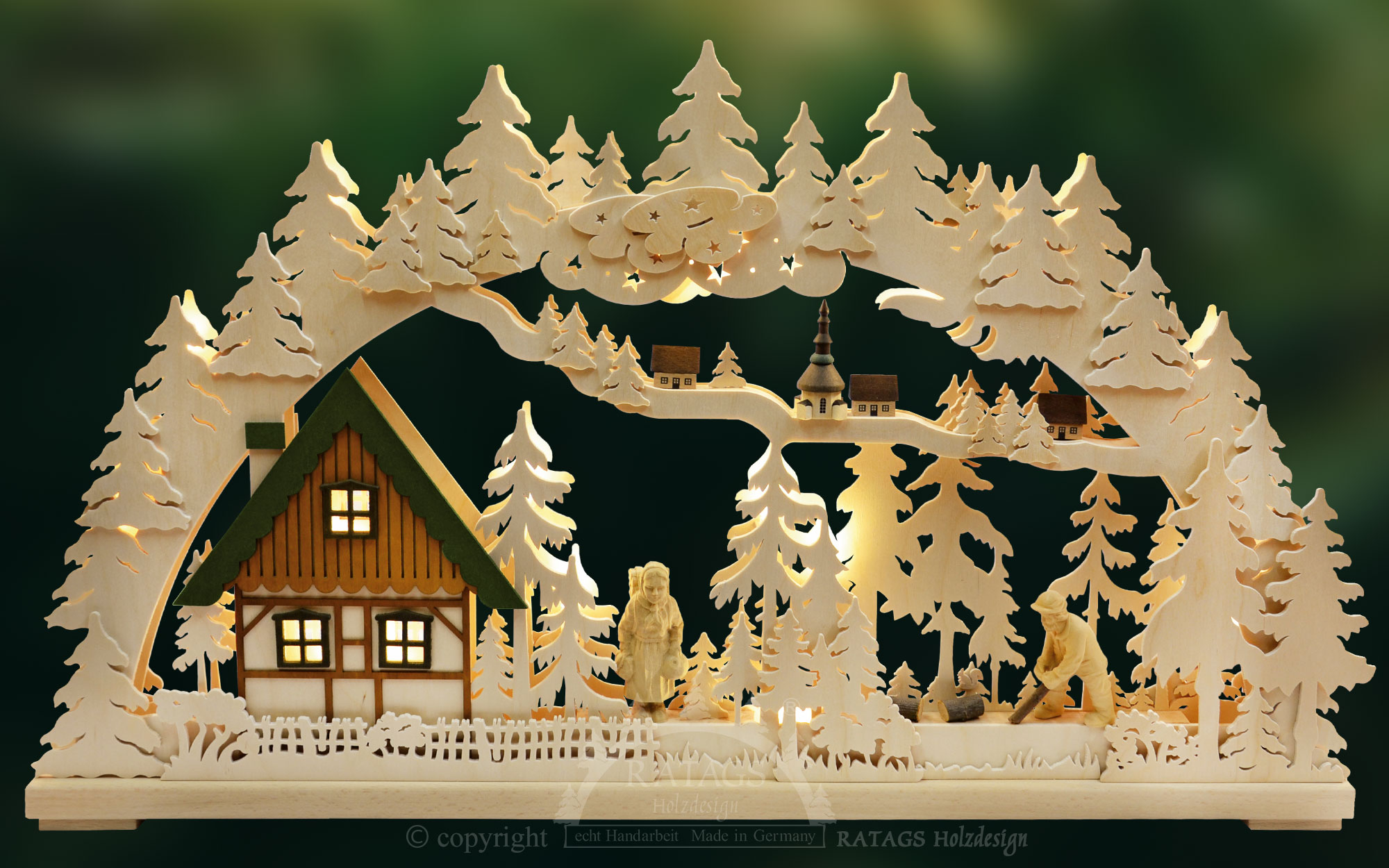 Der Schwibbogen Altseiffener Handwerk zeigt in der Ferne das Dorf Seiffen mit seiner charakteristischen Kirche. Zwei geschnitzte Massivholzfiguren bilden den zentralen Blickfang dieses typisch erzgebirgischen Schwibbogens. Mit einer Handkarre voller Holz und Rücktrage arbeiten sie vor einem farbig gebeizten Haus. Eine Bank lädt zum Verweilen inmitten eines filigran aus Birkenholz gesägten Waldes ein. Die naturbelassenen Bäume bilden einen schönen Kontrast zu den farbigen Dächern des kleines Dörfchens. Die blendfrei verbaute Beleuchtung sorgt für eine behagliche Atmosphäre und zieht den Betrachter in seinen Bann.