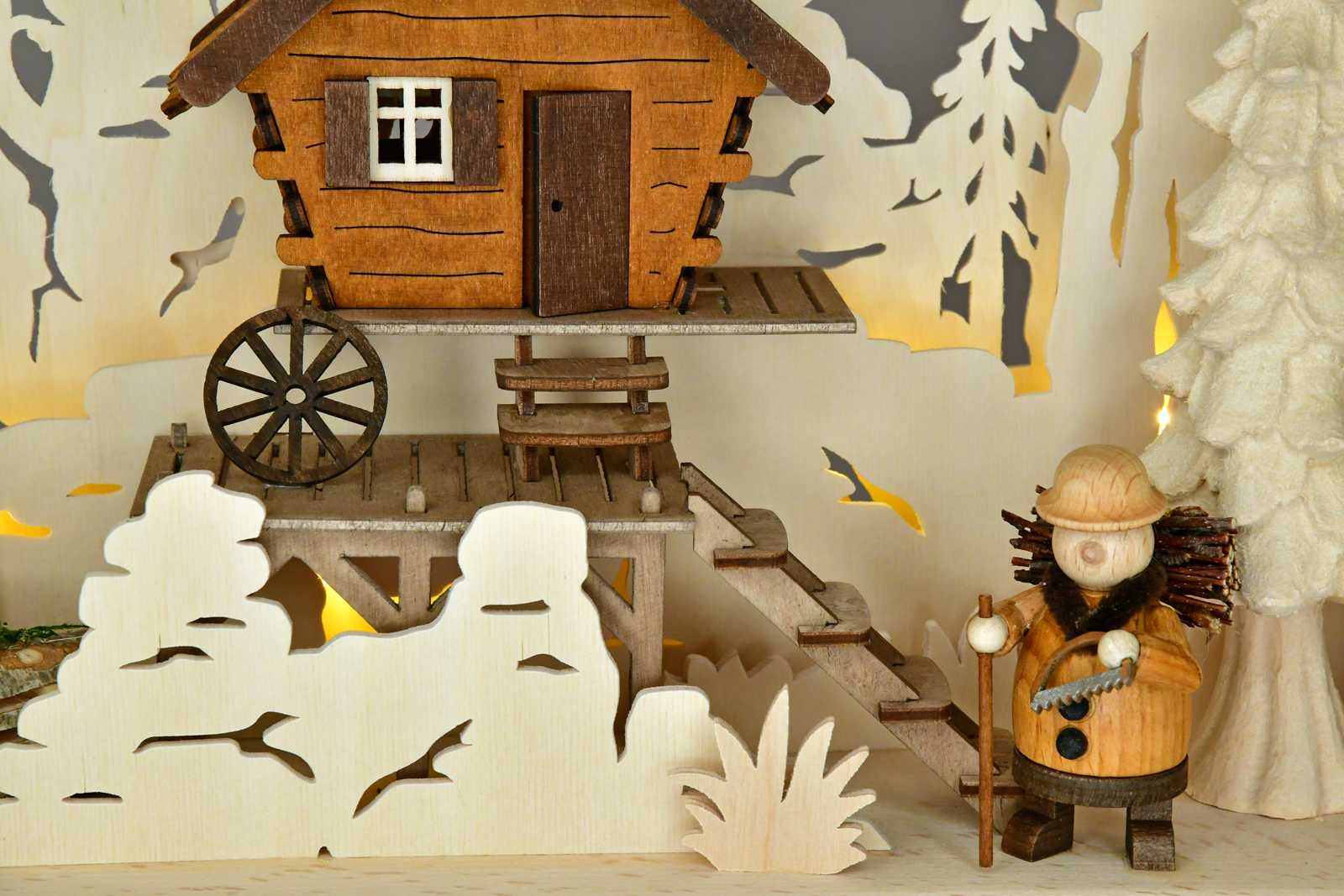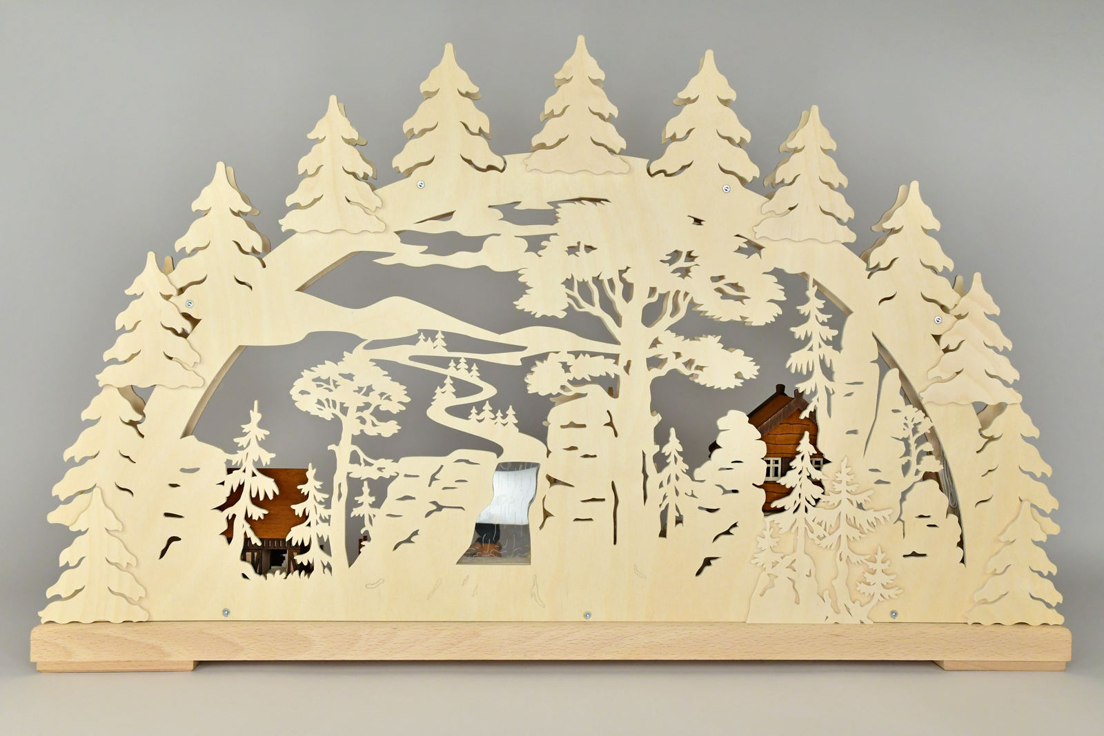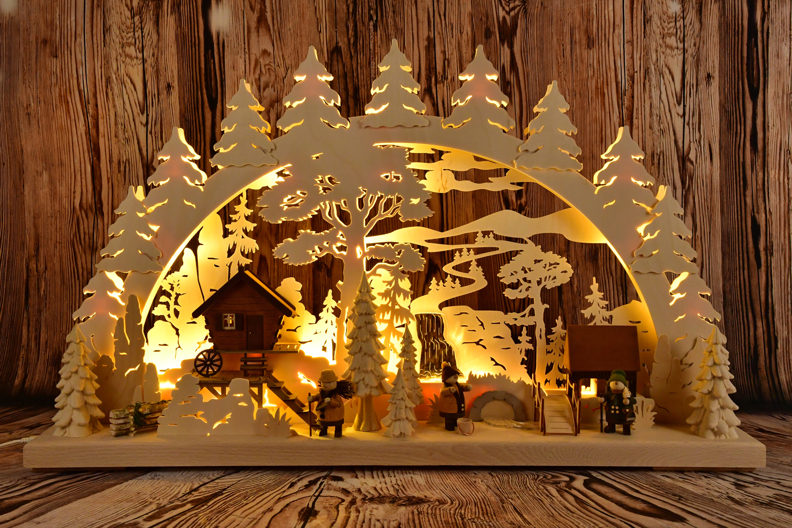 Ein Haus steht am Bach, über eine Treppe erreichbar, vor einem rauschenden Wasserfall im Hintergrund. Drei fleißige Selbstversorger gehen ihren Tätigkeiten nach: Brennholz für die kalten Tage wird gesammelt, Wasser herbeigeschafft und der Großvater kümmert sich um ein kleines Tannenbäumchen für die Stube. Eine mächtige Eiche bietet Schatten und Sandsteinfelsen begrenzen die Szenerie. Ein stimmungsvoller 3D-Schwibbogen mit besonderer Tiefenwirkung. Alle Figuren und mehrere Tannenbäume sind aus Massivholz gefertigt. Ein besonderer Effekt wird durch den Einsatz von Plexiglasintarsien für das Element Wasser erzeugt.