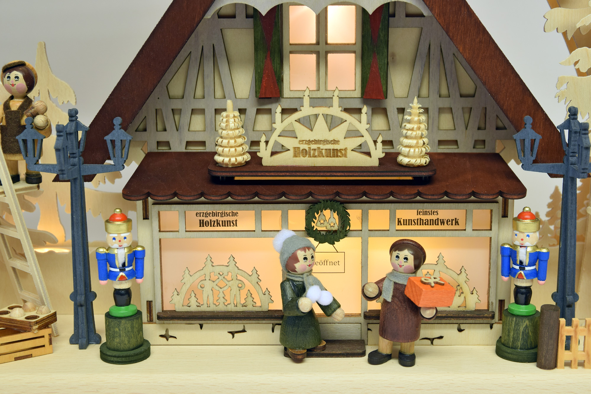 Dieser opulent ausgestattete Schwibbogen zeigt rege Betriebsamkeit in der Vorweihnachtszeit. Ein erzgebirgisches Fachgeschäft lädt zum Bummeln ein, die matten erleuchteten Schaufenster verheißen ein verführerisches Angebot. Ein Handwerker steht auf der Leiter und schmückt den Straßenzug, während ein Pärchen schon das erste Weihnachtsgeschenk gekauft hat. Ein munteres Hündchen springt die Treppe hoch. Alle Figuren sind aus Massivholz gearbeitet. Die indirekt verbaute, blendfreie LED-Beleuchtung schafft eine behagliche Atmosphäre. Ein dekoratives Stück Handarbeit für Erzgebirgsliebhaber aus dem Hause RATAGS.