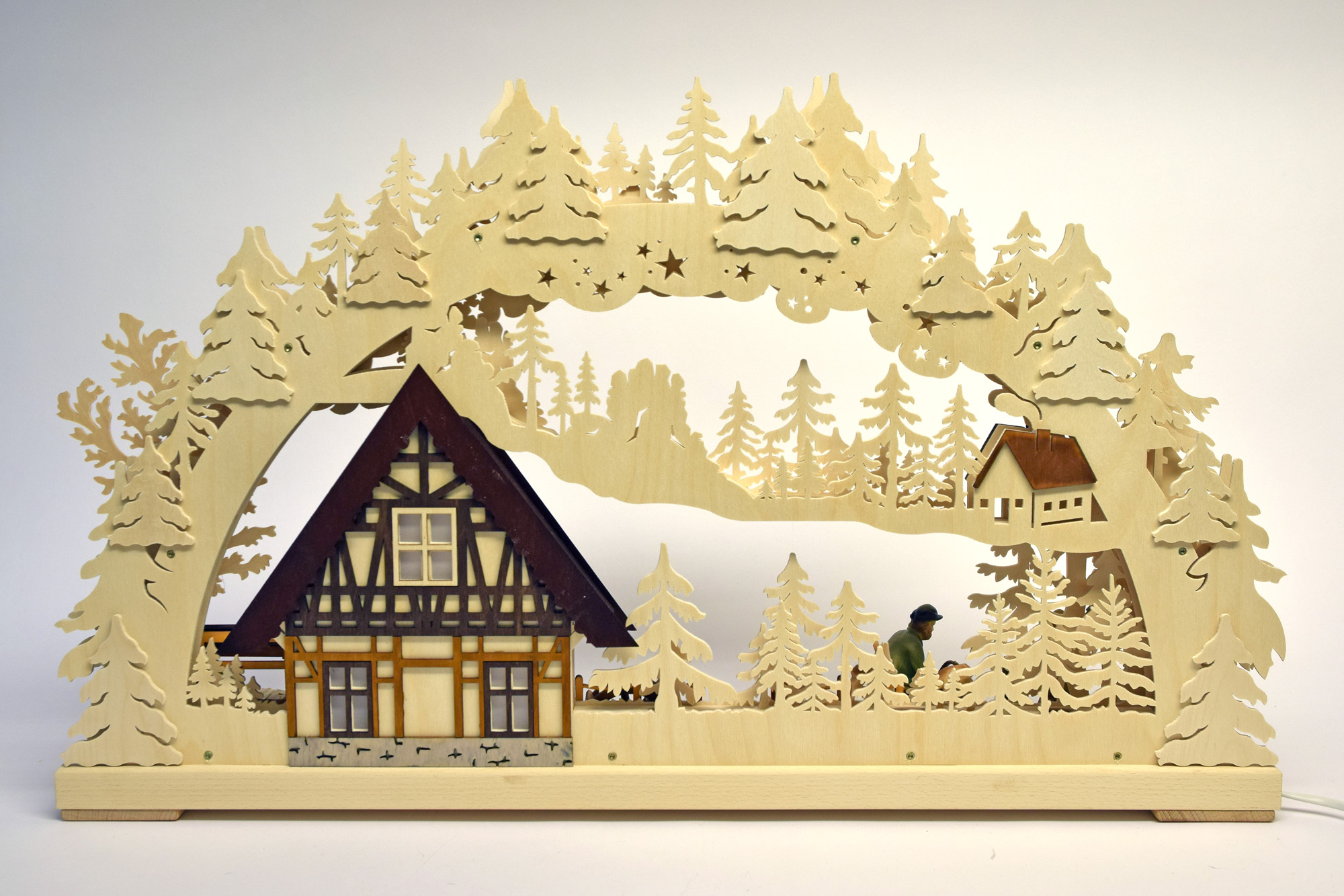 Dieser opulente Schwibbogen zeigt die Arbeit einer einstigen Sägemühle. Das Sägewerk wird über ein Mühlrad durch Wasserkraft angetrieben. Die indirekt verbaute, blendfreie LED-Beleuchtung schafft eine behagliche Atmosphäre. Ein dekoratives Stück Handarbeit nicht aus dem Hause RATAGS.