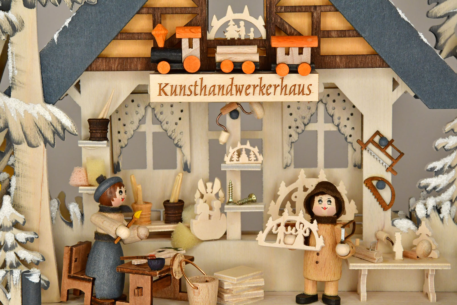 Die Schwibbogenwerkstatt im Kunsthandwerkerhaus ist ein wundervoller Ort sein Handwerk auszuüben. Man meint, den Geruch von Holz in der Nase zu spüren und in Hobelspäne greifen zu müssen. Mehrere Arbeitsgänge sind nötig, damit ein Schwibbogen entstehen kann. So werden hier die Vorbereitung des Rohmaterials über das aussägen, verschleifen, montieren und mit Beleuchtung versehen bis zur Bemalung dargestellt. Ein Muss für jeden Liebhaber des Erzgebirges. Die blendfrei montierte LED-Beleuchtung verbreitet eine stimmungsvolle Atmosphäre. Glitzernder Raureif bildet das i-Tüpfelchen auf diesem Schwibbogen.