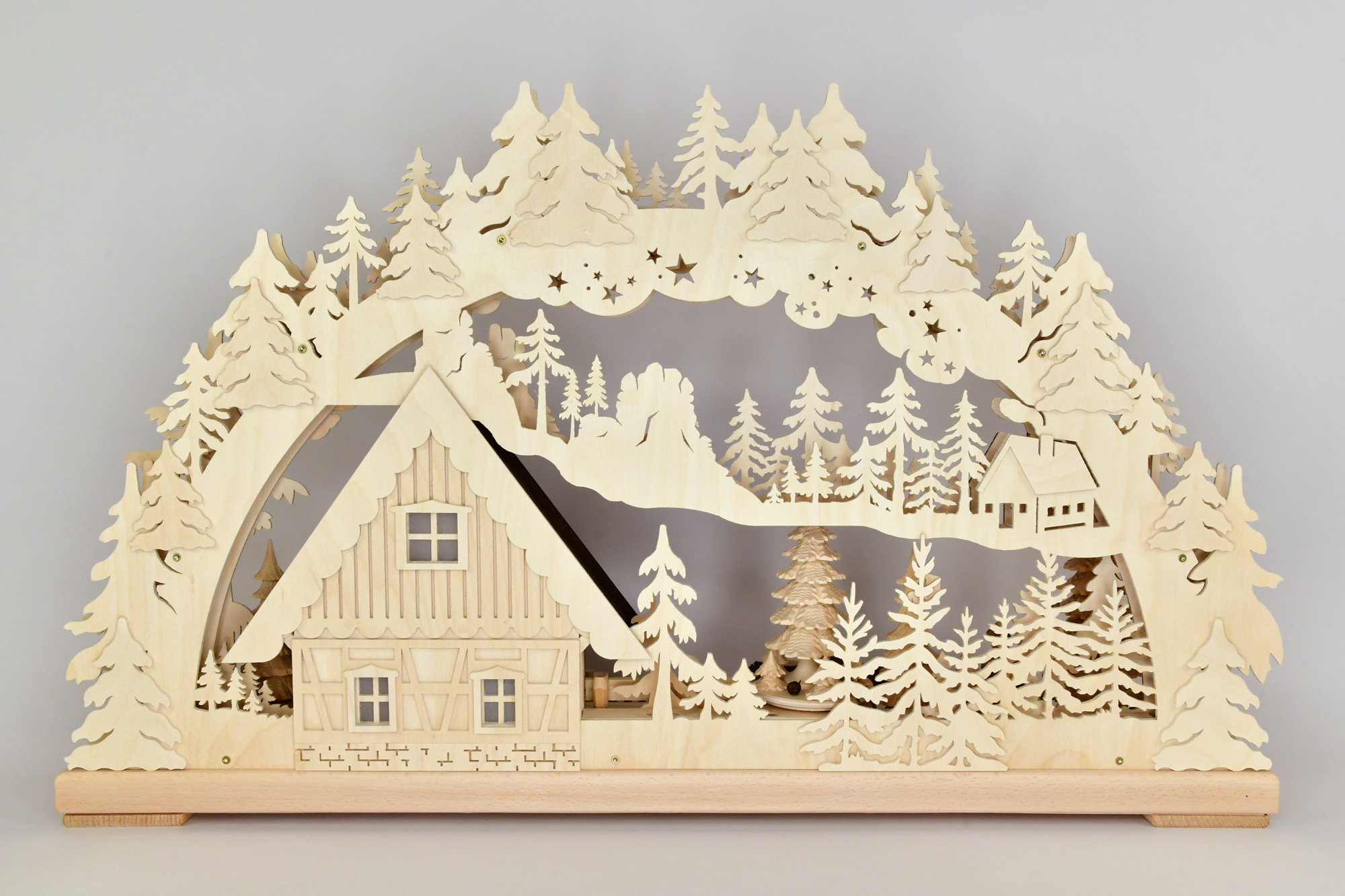 Blickfang dieses opulenten RATAGS Schwibbogens ist das alte Zollhaus. Es ist in Fachwerk ausgeführt und steht eingebettet in einen dichten Wald. In der Ferne sind ein weiteres Fachwerkhaus und Sandsteinfelsen erkennbar. Vor dem Alten Zollhaus patroulliert ein Wachmann mit Hellebarde, begleitet von seinen beiden Hunden. Auf einer nahegelegenen Lichtung schlägt ein Waldarbeiter Holz und wird dabei beobachtet von zwei friedlich äsenden Rehen. Alle Figuren sind in Massivholz ausgeführt, geschnitzt und farbig lasiert. Hochwertige Massivholzbäume zieren den Vordergrund. Ein weiteres Highlight dieses erzgebirgischen Schwibbogens ist die sich drehende elektrische Pyramide. Für eine zauberhafte Beleuchtung der idyllischen Szenerie sorgt eine blendfrei montierte LED-Lichterkette.