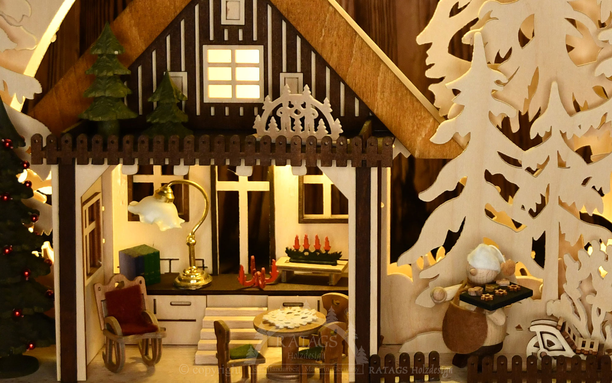 Tief im Wald liegt die Weihnachtsbäckerei. Heißer duftender Kaffee lockt in die festlich geschmückte Stube. Der Bäcker und die Gesellen tragen Kuchen und Naschwerk herbei. Der mit indirekter LED-Beleuchtung versehene und mit vielen handgefertigten Details ausgestattete RATAGS 3D-Schwibbogen schmückt Ihre Weihnachtssube auf das vortrefflichste und zieht jeden Betrachter in seinen Bann.