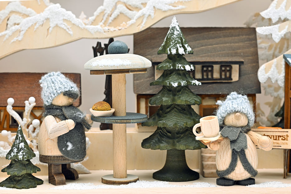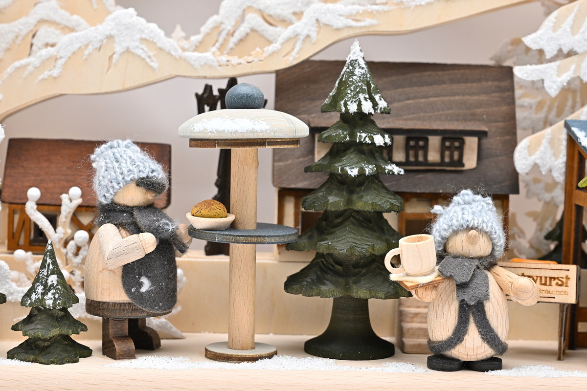 Mit wunderschönen, detaillierten Laubsägearbeiten, von Künstlerhand geschnitzten und bemalten Tannenbäumen und liebevoll gestalteten Hütten verbreitet dieser 3D-Schwibbogen Weihnachtsstimmung pur. 3 lustige Figuren, mit dicken Wollmützen bekleidet, essen Bratwurst und trinken Glühwein. Eine blensfrei angebrachte LED-Lichterkette bringt nicht nur die Fenster der dekorativ colorierten Häuser zum Leuchten, sondern lässt auch den Sternenhimmel über den Bergen erstrahlen.