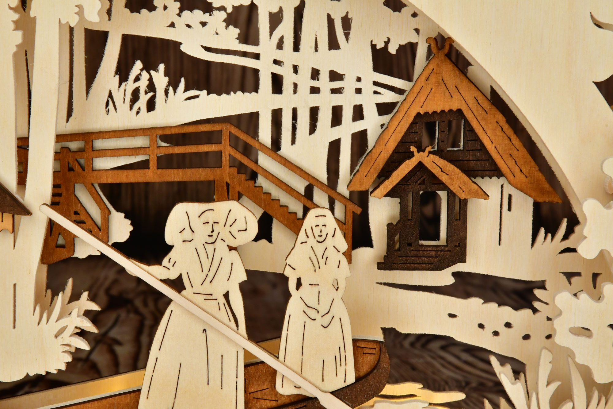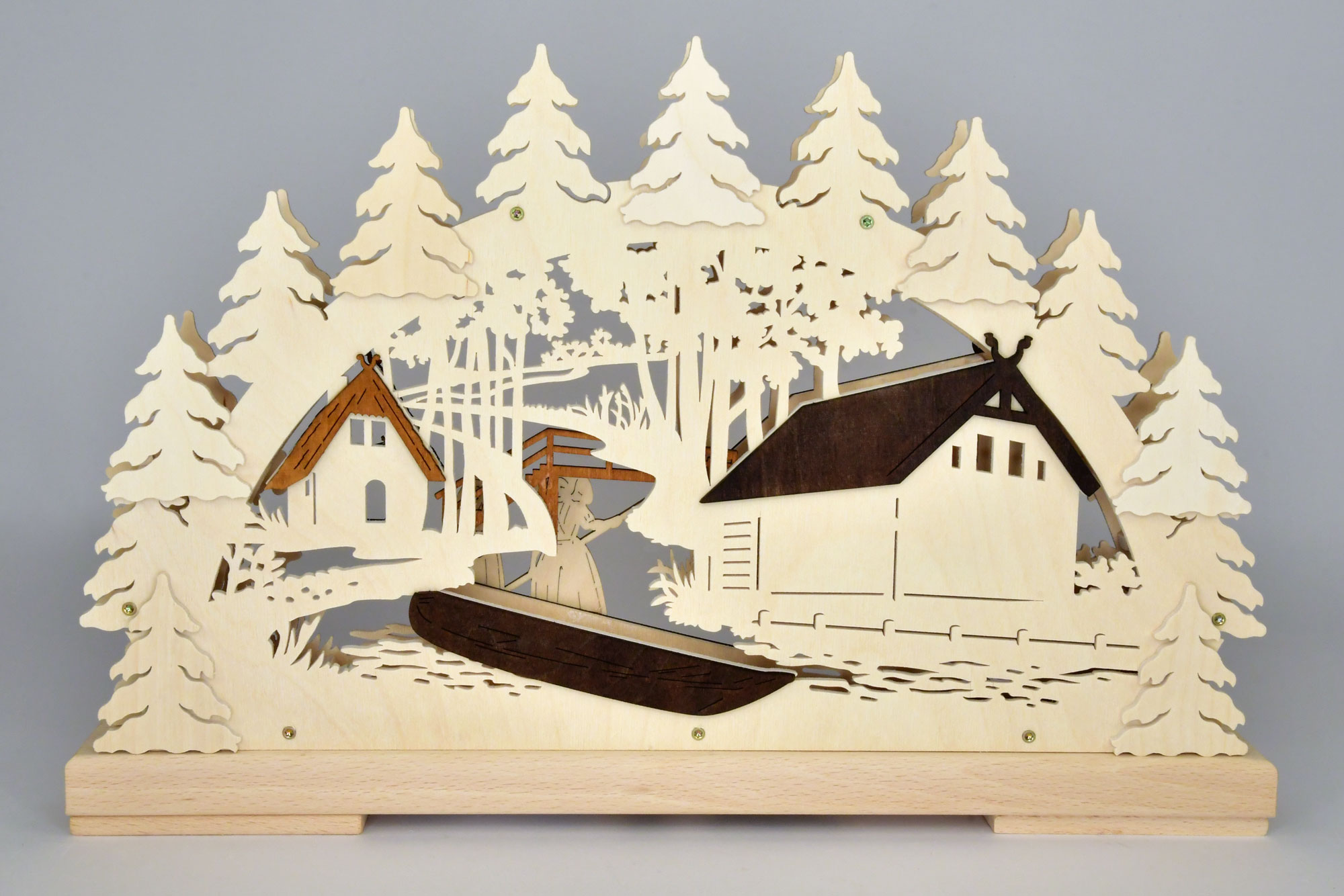 Zwei Spreewald-Häuschen stehen in der Wasserlandschaft der Spree, gesäumt von fruchtbaren Wiesen. Zwei Frauen in charakteristischer Spreewaldtracht staken ihren Kahn vorüber an einem Korbmacher, der frische Weidenzweige zu Geflecht verarbeitet. In der Ferne kann man eine typische Spreewaldbrücke ausmachen, die hoch über dem Fluß die Durchfahrt der Bote ermöglicht. Stimmungsvoll beleuchtet wird die Szenerie durch eine blendfrei verbaute LED-Beleuchtung. Ein Schwibbogen für das ganze Jahr.