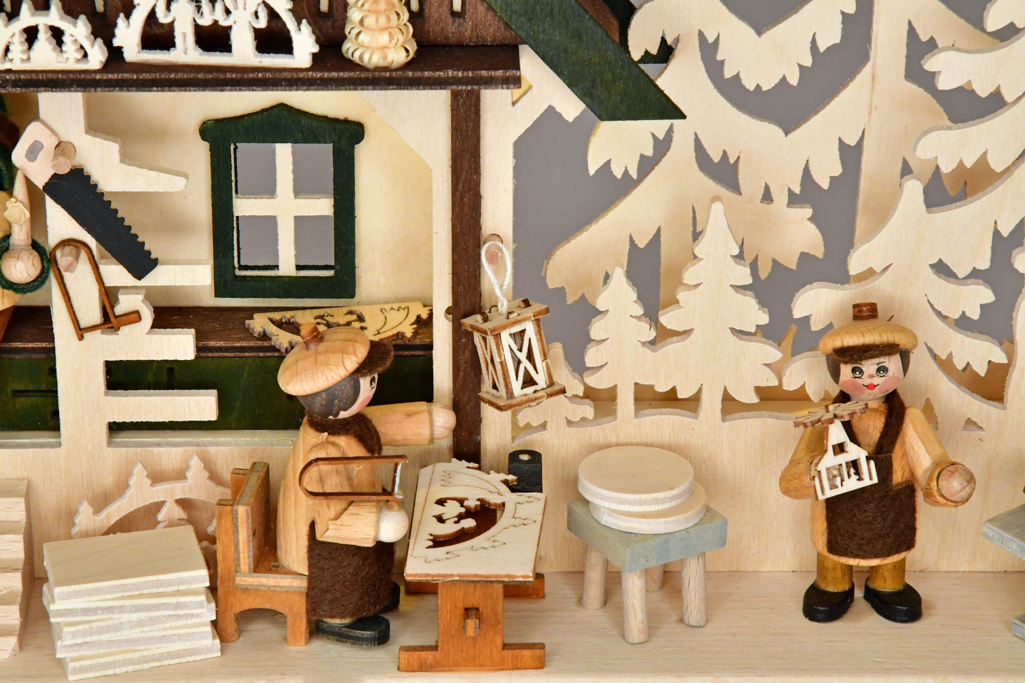 Diese erzgebirgische Kunsthandwerkerstube zeigt die Herstellung von Schwibbögen und Pyramiden, das traditionelle Spanbaumstechen und einen Schnitzer bei der Arbeit. 4 original RATAGS Figuren werkeln fleißig in dem handbemalten 3D-Schwibbogen. Das in Grün und Braun kolorierte Fachwerkhaus ist mit vielen erzgebirgischen Handarbeiten dekoriert. Auf dem Außenbogen ist das Dorf Seiffen mit der bekannten Bergkirche malerisch in den Tannenwald eingebettet. Eine verdeckt angebrachte LED-Lichterkette sorgt für eine gemütliche Beleuchtung.