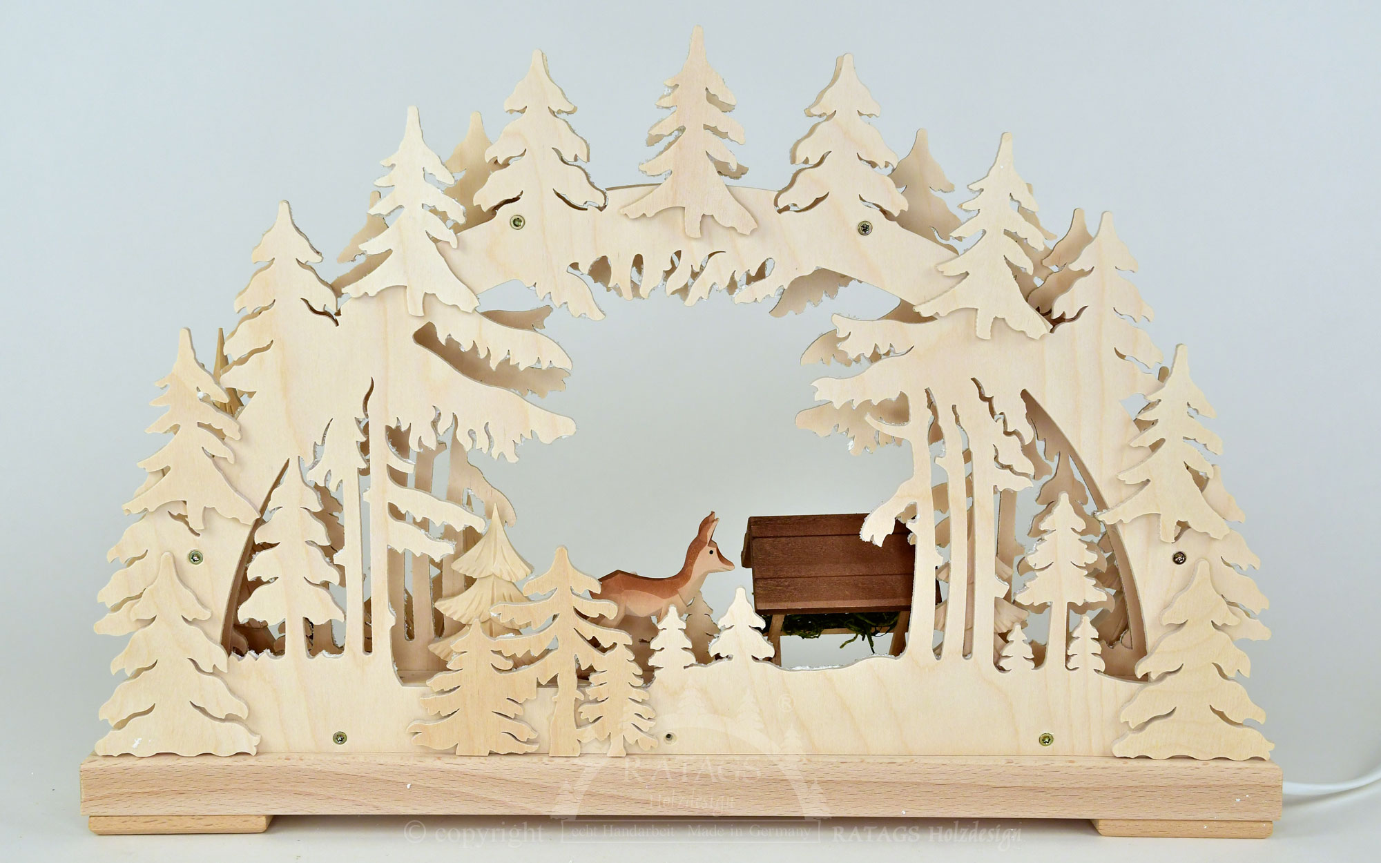 Highlight dieses erzgebirgischen 3D-Schwibbogens sind die vielen Rehe an einer Futterkrippe mit Heu. Neben den 6 Tierfiguren sind auch die Bäume im Vordergrund liebevoll von Hand geschnitzt. Durch mehrere unterschiedliche aus 3 mm Birkensperrholz gesägte Waldabschnitte entsteht eine wunderbare räumliche Tiefenwirkung, die durch eine indirekte Beleuchtung noch verstärkt wird.
