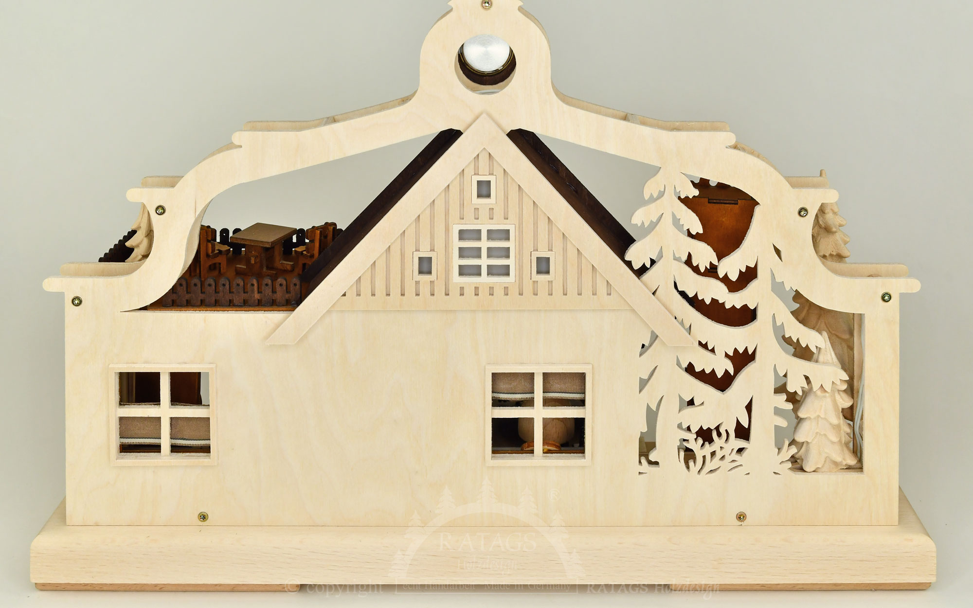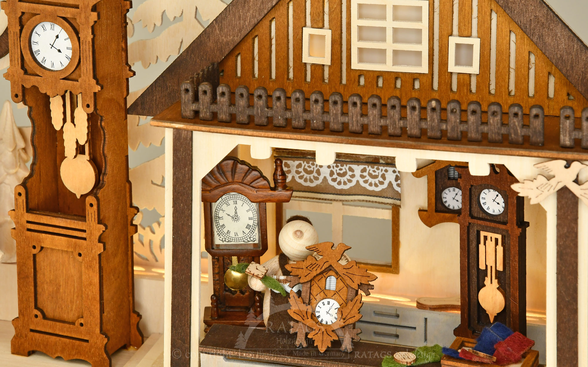 Der 3D-Schwibbogen "Uhrmacherwerkstatt" ist mit Finesse und viel Liebe zum Detail gefertigt. 2 gedrechselte Uhrmacher werkeln in einem gemütlich eingerichteten Fachwerkhaus. In der einen Stube befindet sich die Werkstatt mit allerlei Utensilien, in der anderen der Verkaufsbereich hinter einer Theke. Auch der Dachgarten ist mit Tisch und Stühlen ausgestattet. Den Platz vor der Werkstatt ziert eine große Kuckucksuhr. Handgeschnitzte Tannenbäume runden das Bild ab. Das i-Tüpfelchen dieses Lichterbogens ist eine echte, batteriebetriebene Uhr an exponierter Stelle. Für eine behagliche Beleuchtung sorgt eine versiert angebrachte LED-Lichterkette.