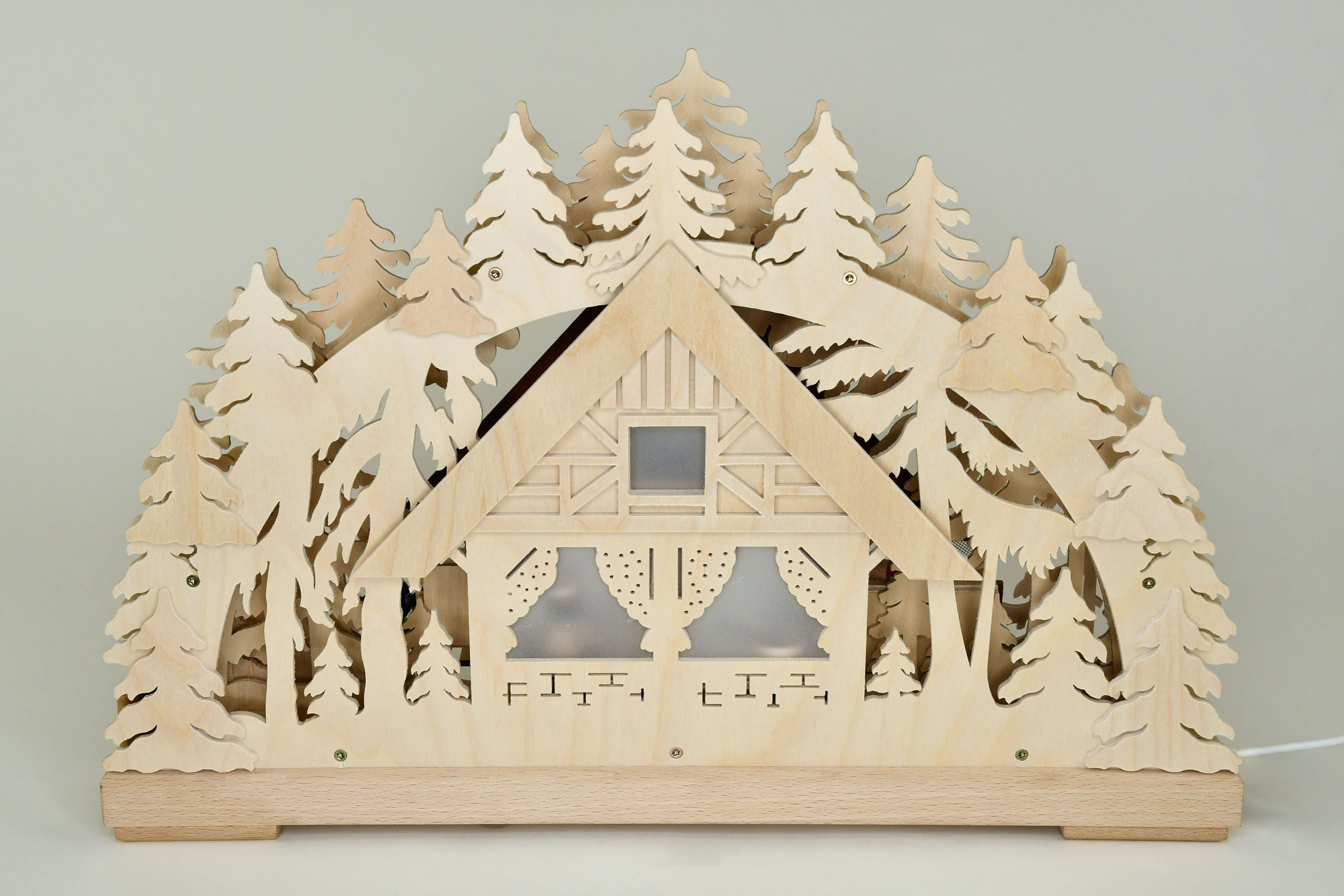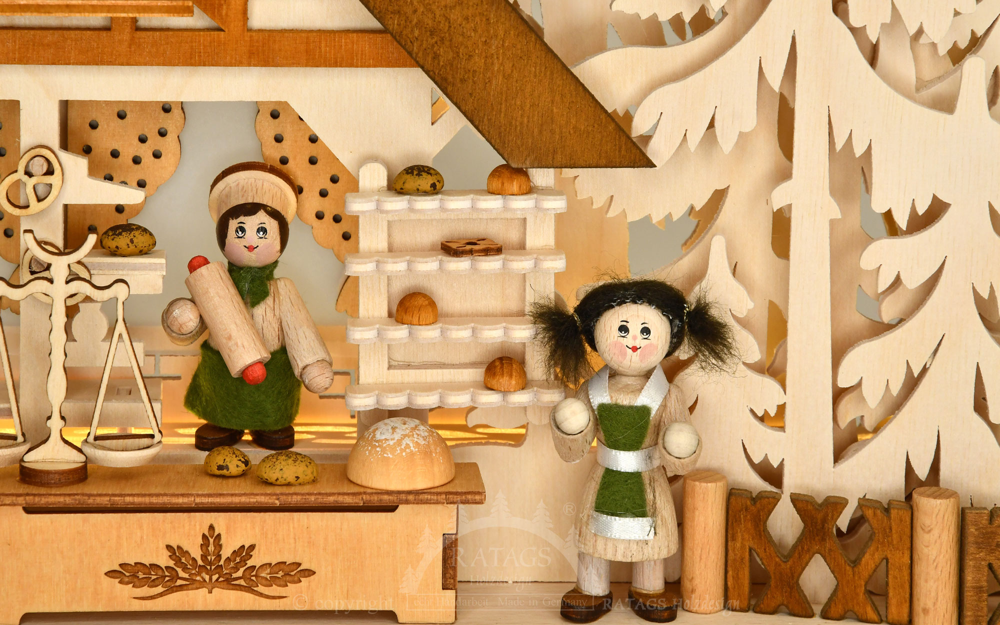 Die Besonderheit dieser Bäckerei liegt in ihrer Beleuchtung. Zusätzlich zur 10-teiligen LED-Lichterkette haben wir einen LED-Stripe verbaut, der den unteren Bereich des Schwibbogen hell ausleuchtet. Umgeben von einem filigranen aus Birkensperrholz gesägten Tannenwald steht die Bäckerei. Drei Ratags-Massivholzfiguren werkeln mit Mützen und Schürzen ausgestattet fleißig am Holzbackofen, in der Küche und an der Verkaufstheke. Dieser erzgebirgische 3D-Schwibbogen enthält viele liebevoll gestaltete und handbemalte Details wie Teigrolle, Sieb, Küchenwaage, Backschüssel, einen Mehlsack mit Karre und natürlich viele leckere Backwaren. Die indirekte LED-Beleuchtung schafft eine stimmungsvolle Atmosphäre.