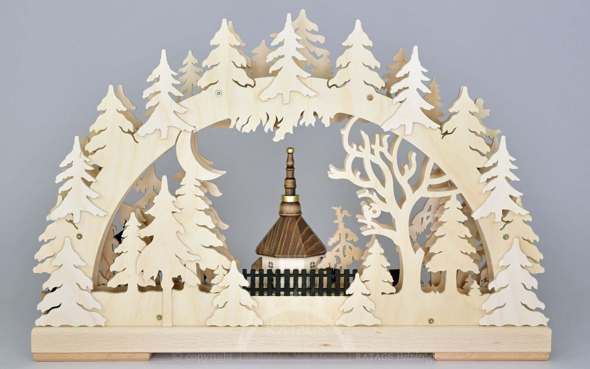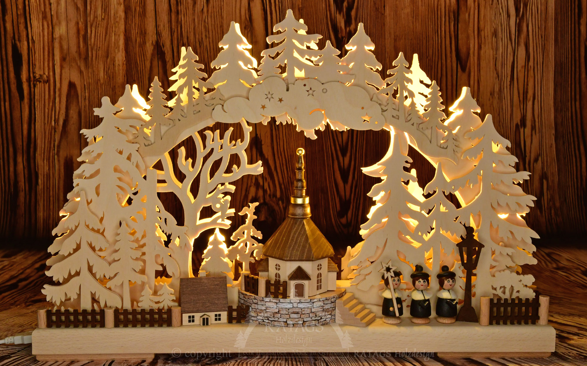 Dieser RATAGS-3D Schwibbogen mit indirekter Beleuchtung zeigt das beliebte Motiv der Seiffener Bergkirche. Im Vordergrund sind ein Häuschen und drei Kurrendesänger platziert. Alle Figuren und Gebäude sind aus Massivholz gefertigt und gebeizt oder von Hand bemalt. Ein echtes Liebhaberstück für Freunde erzgebirgischer Handwerkskunst.
