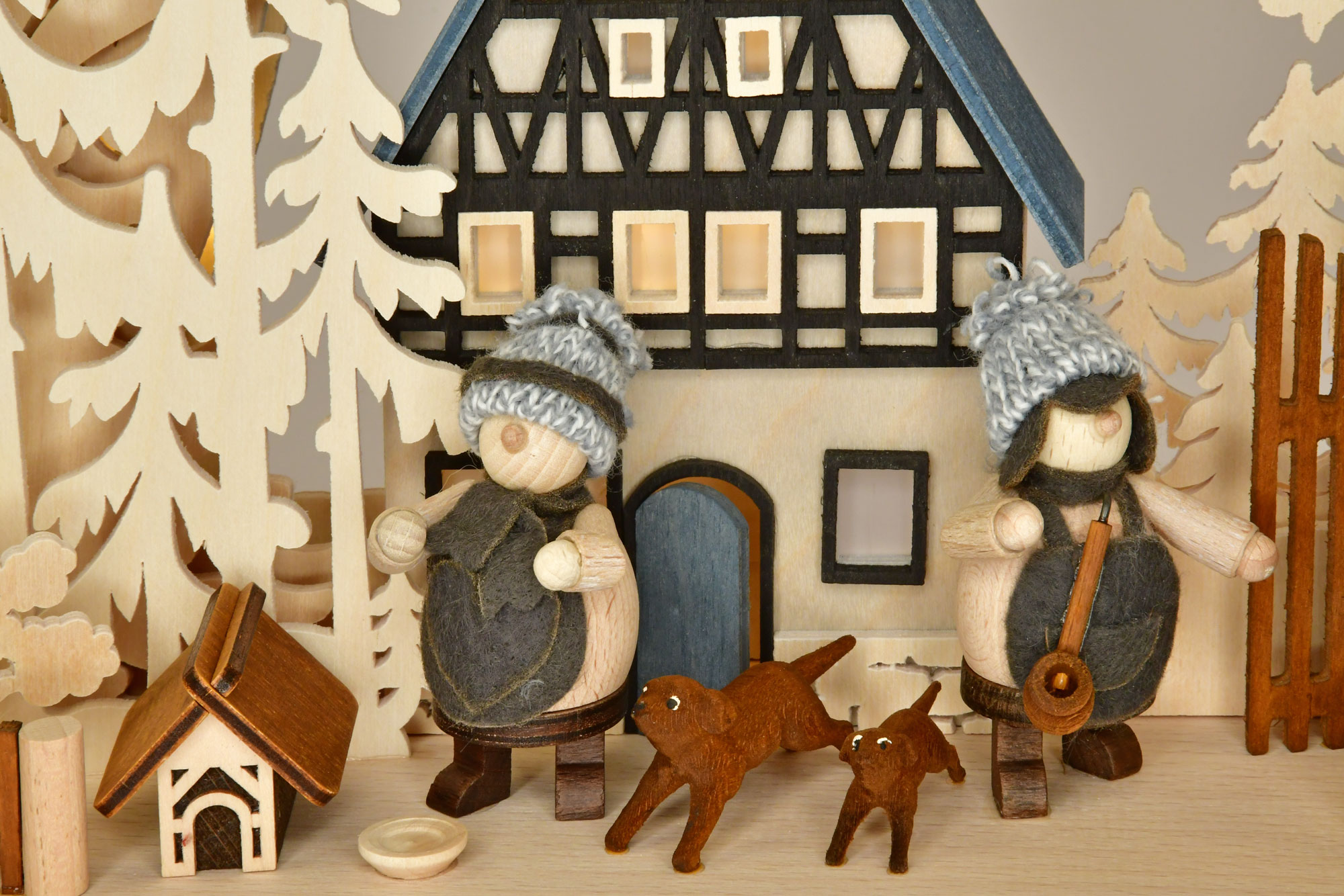 Dieser 3D-Schwibbogen wurde mit großer Liebe zum Detail gefertigt. Ein coloriertes Fachwerkhaus und pittoreske, kleinere Häuschen auf dem Außenbogen bilden einen schönen farbigen Kontrast zu den naturbelassenen Bäumen aus Birkensperrholz. Auch ein Vogelhaus und eine Hundehütte fehlen in diesem Lichterbogen nicht. 2 lustige Molli-Figuren beaufsichtigen 2 Hunde, eine schwarze Katze mit weißen Pfoten und 2 Rehe. Alle Figuren sind aus Massivholz gefertigt und farbig bemalt. Durch die blendfrei installierte LED-Lichterkette sind alle Fenster hell erleuchtet und tauchen den gesamten Lichterbogen in ein stimmungsvolles Licht.