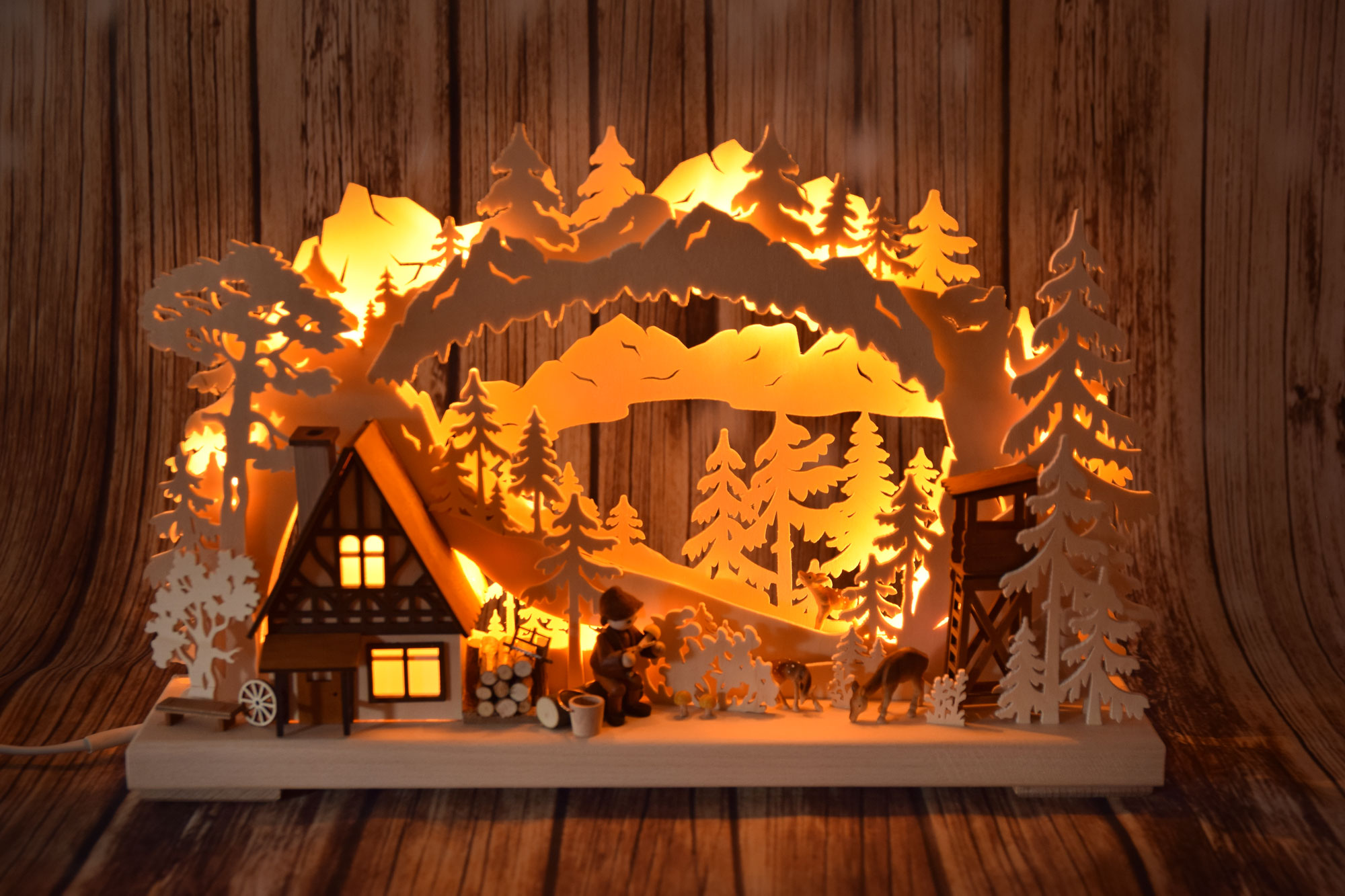 Dieser detaillierte Schwibbogen zeigt einen erfolgreichen Pilzsammler beim Putzen seiner Beute. Dabei sitzt er vor seinem hübsch erleuchteten Fachwerkhäuschen. Zwei Rehe äsen friedlich im Mischwald und haben von dem unbesetzten Jägeranstand nichts zu befürchten. Ein Holzstapel vor dem Haus verspricht ein behagliches Zuhause. Diese friedliche Szenerie ist eingebettet in eine hügelige Landschaft, die in der Ferne von einem hohen Gebirge überragt wird. Ein schönes Stück erzgebirgischer Holzkunst für die Advents- und Weihnachtszeit.