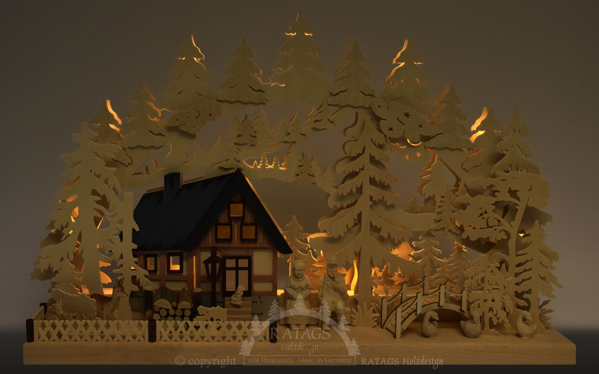 Der 3D-Schwibbogen "Am Waldbach" strahlt den Frieden des reifen Alters aus. Ein älteres Ehepaar genießt das leise Rauschen eines Bächleins auf einer Bank vor ihrem Haus. Ihr kleiner Hund leistet ihnen dabei Gesellschaft. Durch den Garten streifen zwei Rehe und Enten schwimmen unter einer kleinen Brücke hindurch und machen diesen erzgebirgischen Lichterbogen zu einem Sinnbild für Ruhe und Gelassenheit. Alle Figuren sind detailiert handgeschnitzt. Für eine gemütliche Beleuchtung sorgt eine gezielt angebrachte LED-Lichterkette.