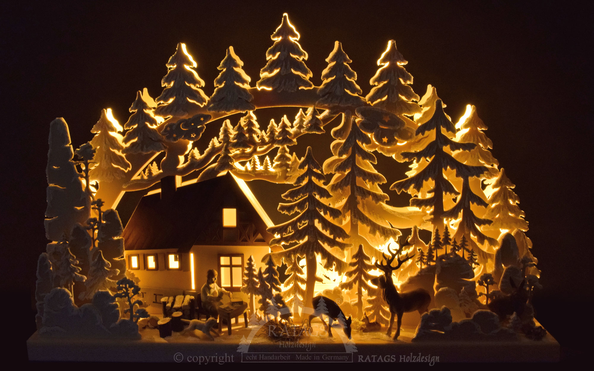 Inmitten eines idyllischen Tannenwaldes, umgeben von schroffen Felsformationen arbeitet ein Schnitzer vor seinem Haus. Gesellschaft leistet ihm dabei sein treuer Hund. Glitzernder Raureif lässt die Kälte des Winters erahnen. Am Waldrand äst friedlich eine Hirschfamilie. Alle Figuren im 3D-Schwibbogen sind liebevoll von Künstlerhand geschnitzt und bemalt, auch das Werkzeug ist detailliert gearbeitet. Das braun lasierte Fachwerkhaus bildet einen schönen Blickfang inmitten des Waldes. Eine blendfrei angebrachte LED-Lichterkette bringt nicht nur die Fenster des Hauses zum Leuchten, sondern auch die Sterne am Himmel zum Strahlen.