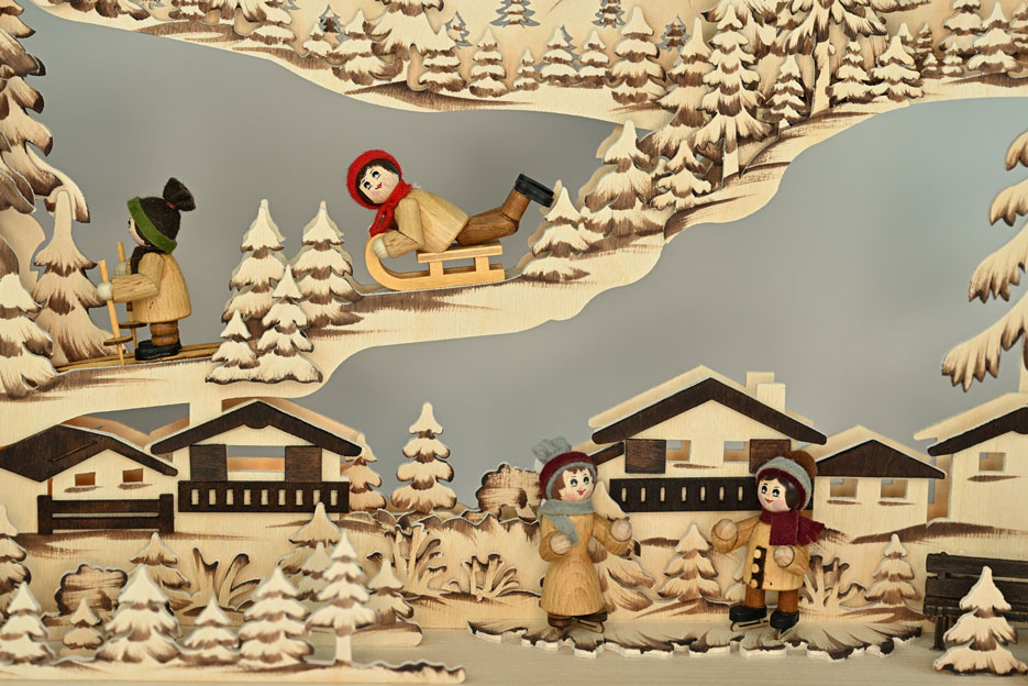 Dieser handcolorierte Schwibbogen zeigt eine gebirgige Landschaft. Ski und Rodel gut â und auch die Schlittschuhe sind nicht umsonst dabei. Alle Figuren sind aus Massivholz gefertigt. In der Ferne sieht man die Häuser des Ortes und Berge. Eingerahmt ist die Szenerie in einen Bogen aus beschneiten Bäumen und hohen Bergen. Die blendfrei verbaute indirekte Beleuchtung sorgt für eine behagliche Atmosphäre.