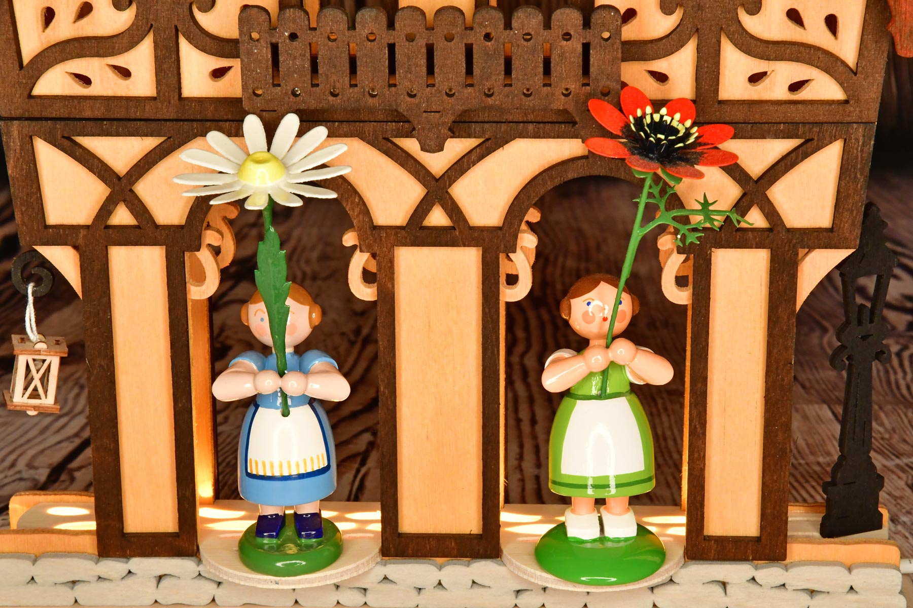Dekorative Fachwerkhäuschen in vier verschiedenen Farben für Sammlerfiguren geeignet und mit LED-Stripe beleuchtet. Das filigrane Fachwerk hebt sich lebendig von den colorierten Fassaden ab und kontrastiert zu den verschiedenfarbigen Dächern. Die Häuschen sind von beiden Seiten gleichermaßen liebevoll gestaltet. Die USB-Stromversorgung ermöglicht eine dezentrale Aufstellung.