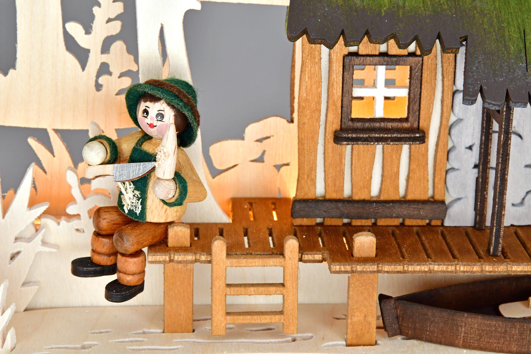 Inmitten einer idyllischen Waldszene steht ein Haus am See. Sein Bewohner sitzt auf dem Steg und schnitzt an einem Bäumchen. Unter dem Steg wartet der Kahn auf seine Bestimmung. Ein Eimer steht bereit. Zwei Rehe äsen friedlich am Waldrand. Farbige Akzente setzen die colorierten Figuren und Segmente der Behausung. Dieser RATAGS-Schwibbogen ist indirekt beleuchtet und erzeugt eine stimmungsvolle Atmosphäre.