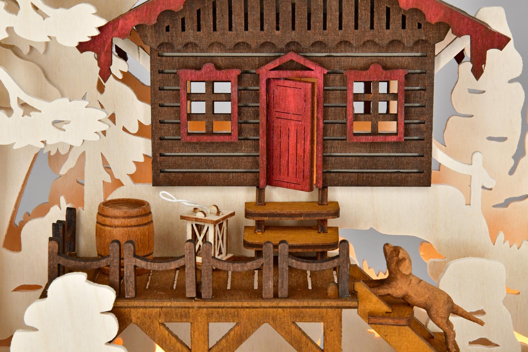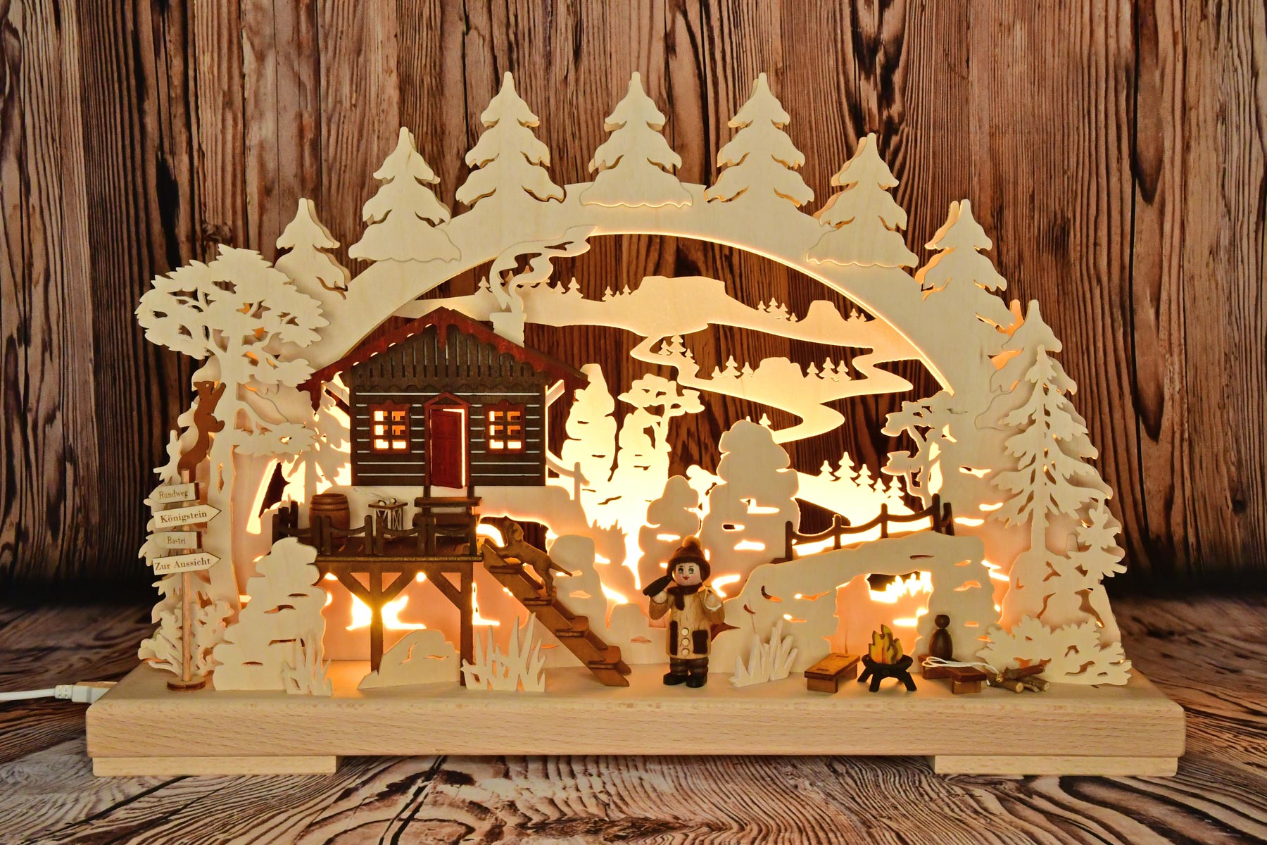 Es mag eine Berghütte sein, in die sich unser Naturfreund eingemietet hat. Sie steht im Elbsandsteingebirge, der Sächsischen Schweiz. Die Terrasse lädt zu besinnlichen Stunden in der Natur ein, man meint die Vögel zwitschern zu hören. Ein munteres Hündchen springt die Treppe hinauf. Gleich unterhalb der Hütte bieten sich Wanderwege zu attraktiven Zielen an. In der Ferne meint man den Lilien- und den Zirkelstein zu erkennen am Elbelauf. Die Figuren sind in Massivholz ausgeführt und farbig coloriert.