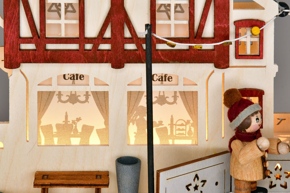 Auf einem stimmungsvollen Marktplatz zur Winterszeit ist vor der Kulisse historischer Fachwerkhäuser eine Eisbahn aufgebaut. Unter einer Lichterkette läuft ein Pärchen Schlittschuh. Ein gemütlich beleuchtetes Café lädt zum Aufwärmen ein, während ein Hündchen an der Laterne ein Vögelchen verbellt. Die Figuren, das Hündchen und die Tanne sind aus Massivholz gefertigt und farbig lasiert. Eine blendfrei montierte LED-Beleuchtung und erleuchtete Fenster verleihen diesem Schwibbogen ein festliches Gepräge.