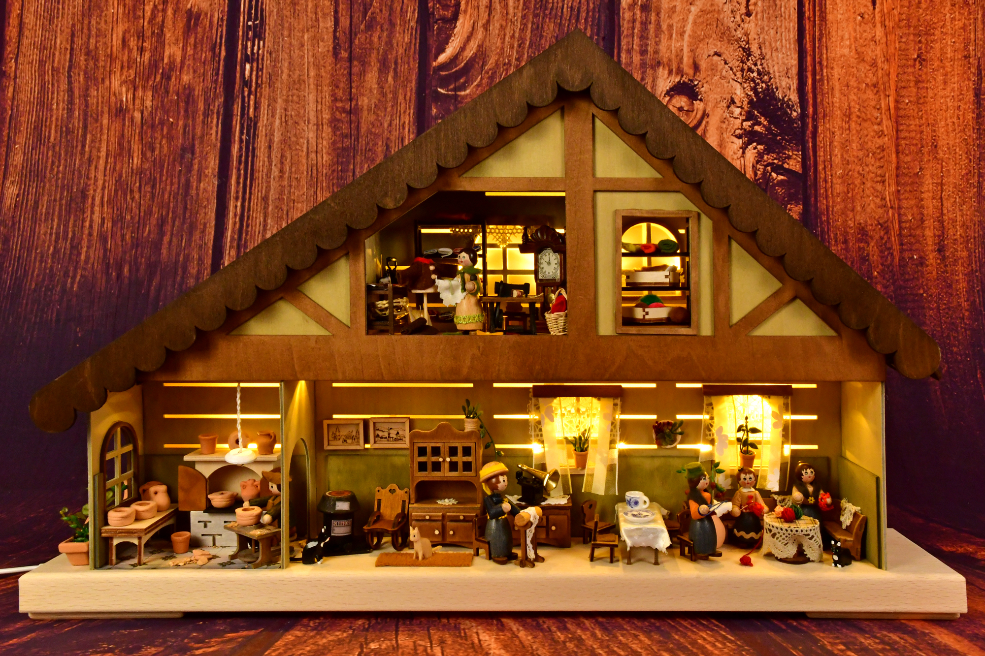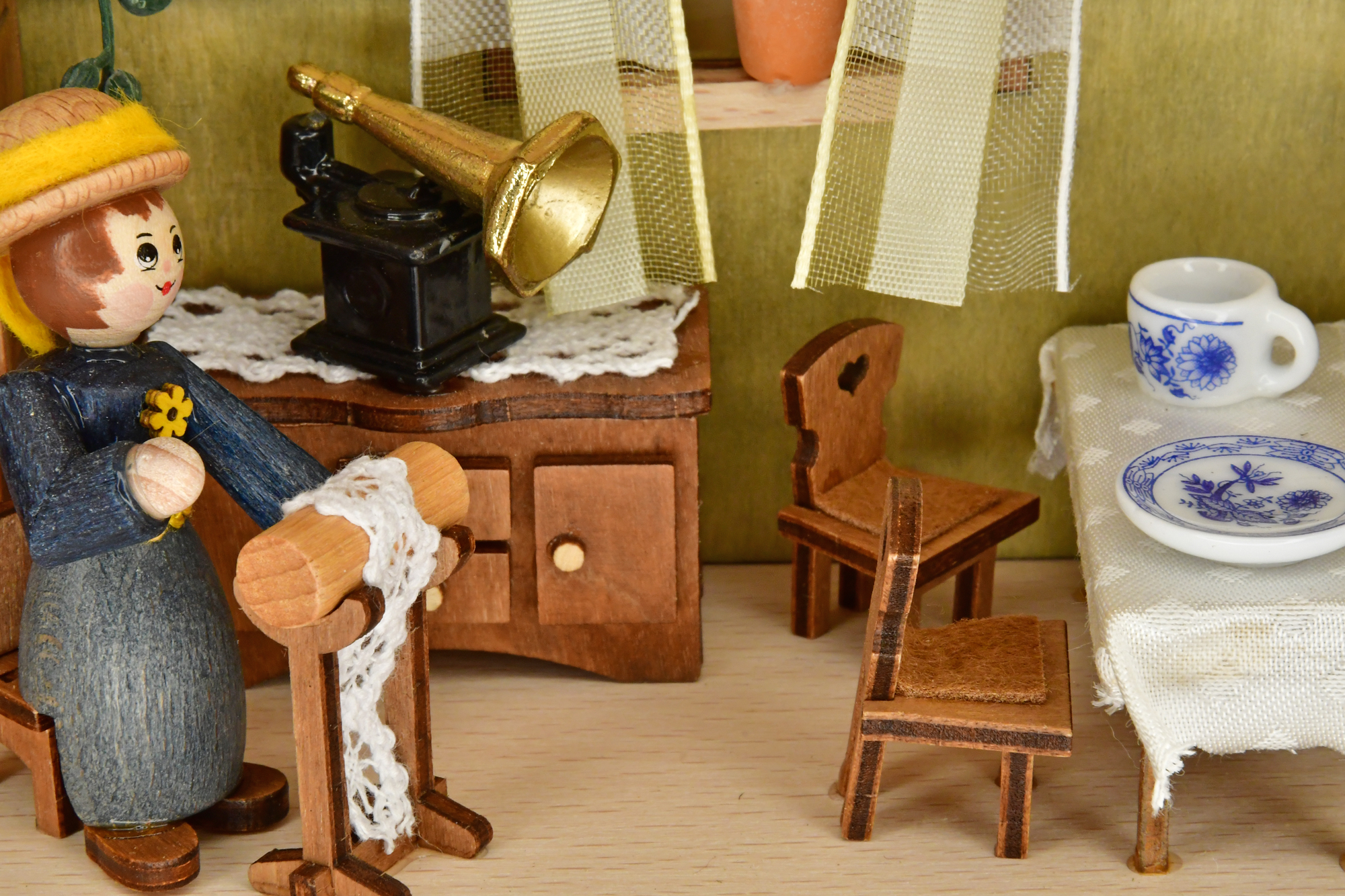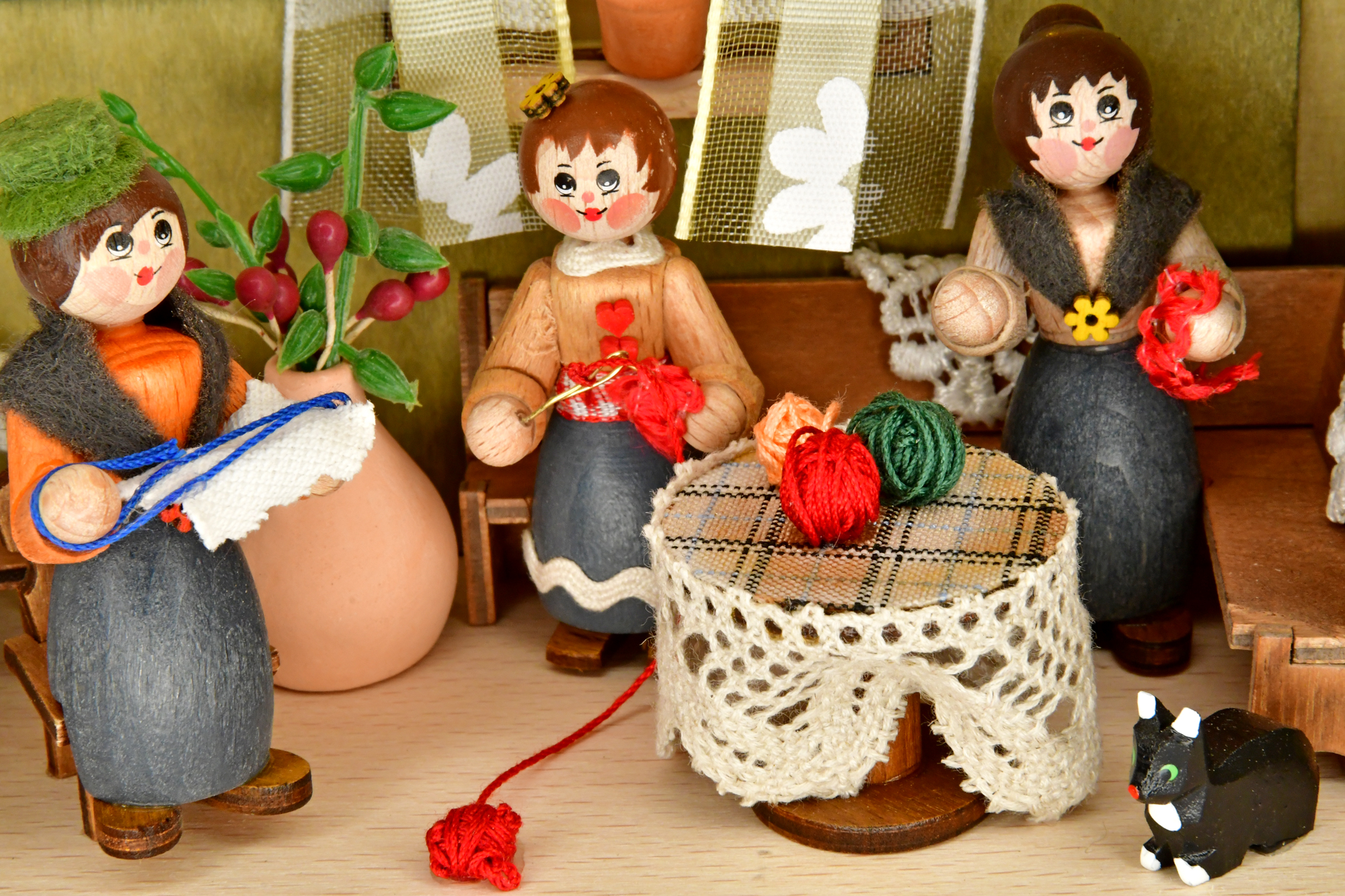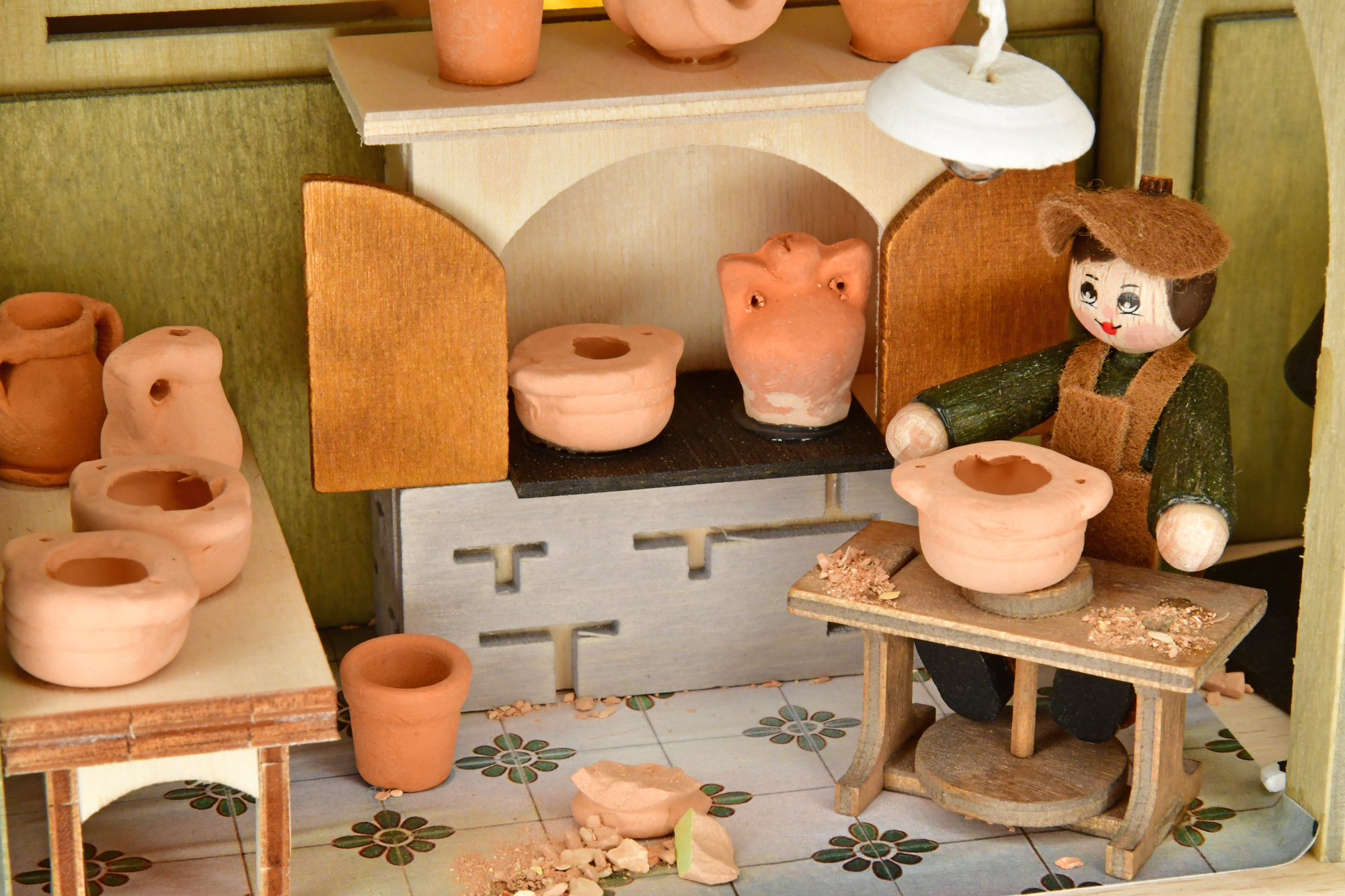 Ein beleuchtetes, dreidimensionales Haus gewährt Einblick in eine sächsische Handarbeitsstube. Klöppel-, Stick- und Strickarbeiten sind ebenso zu sehen wie die Arbeit einer Schneiderin oder eines Töpfers. Die Schneiderei hat im Dachgeschoss Quartier bezogen, der Raum daneben gewährt Einblick in ihre Stoffkammer. Die Töpferei befindet sich im Erdgeschoss. An der Töpferscheibe entstehen neue Keramikwaren, die nach einer Trockenzeit im Brennofen gebrannt werden. Ein Stück ist zu Bruch gegangen, das kann schon mal passieren. Die große Handarbeitsstube befindet sich direkt neben der Töpferei. Gemütlich eingerichtet, bietet sie den drei Damen Platz für Klöppel- und Strickarbeiten. Das wohnliche Ambiente wird durch eine Anrichte, einen wärmenden Ofen sowie den Kaffeetisch unterstrichen. Ein Grammophon ist ber der nötigen Arbeitsmotivation behilflich. Die blendfrei verbaute LED-Beleuchtung sorgt für eine behagliche Atmosphäre und zieht den Betrachter in seinen Bann. Alle Figuren sind in Massivholz ausgeführt.