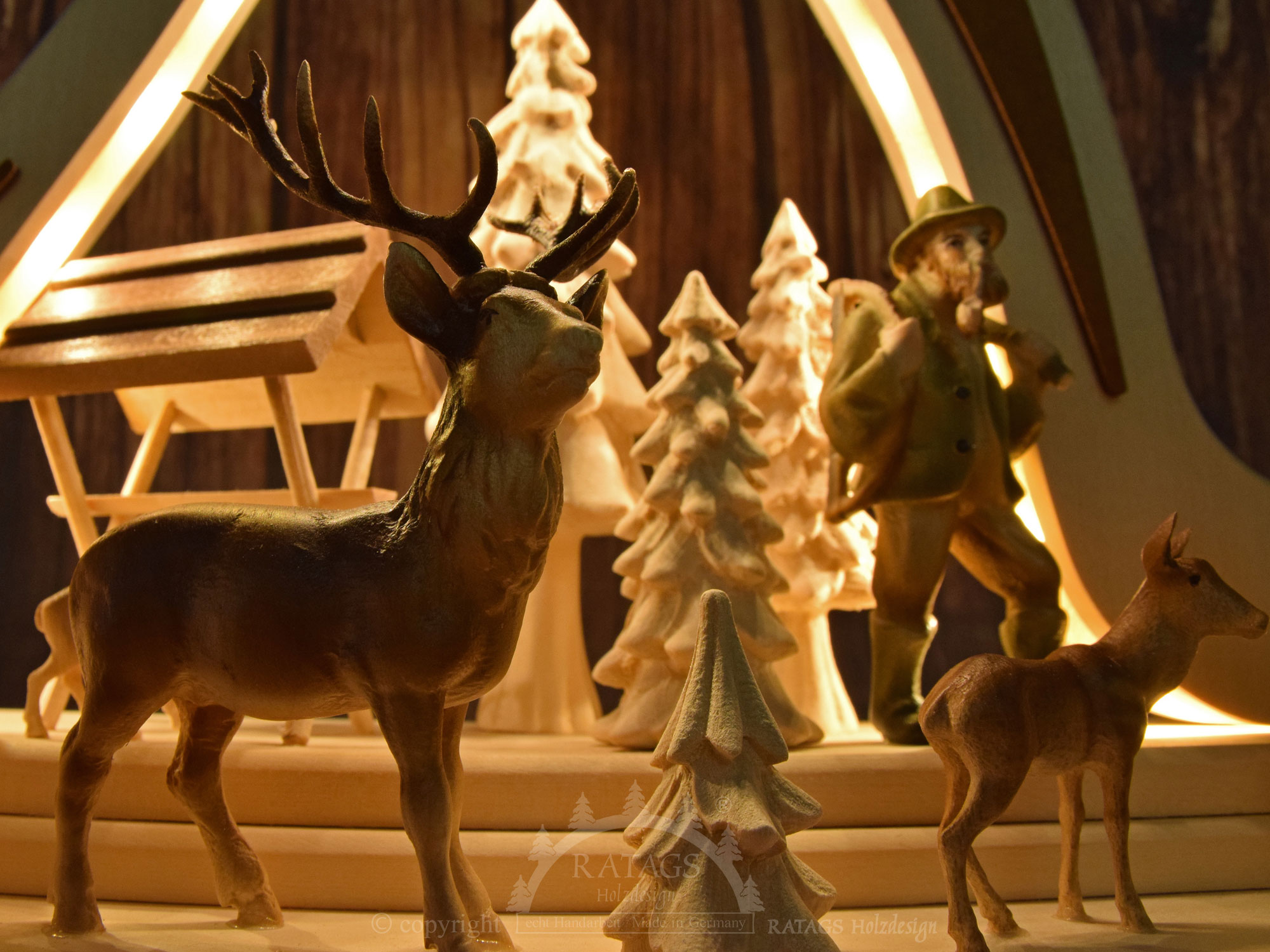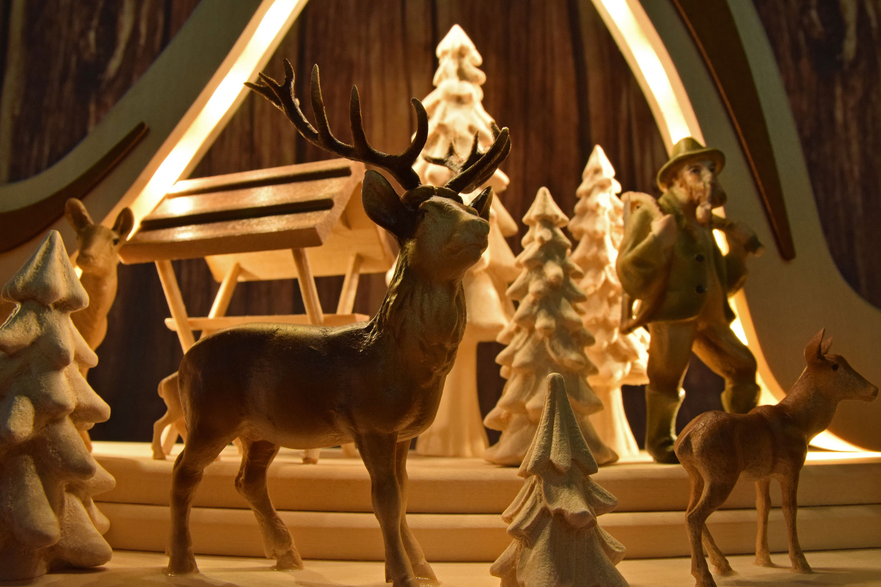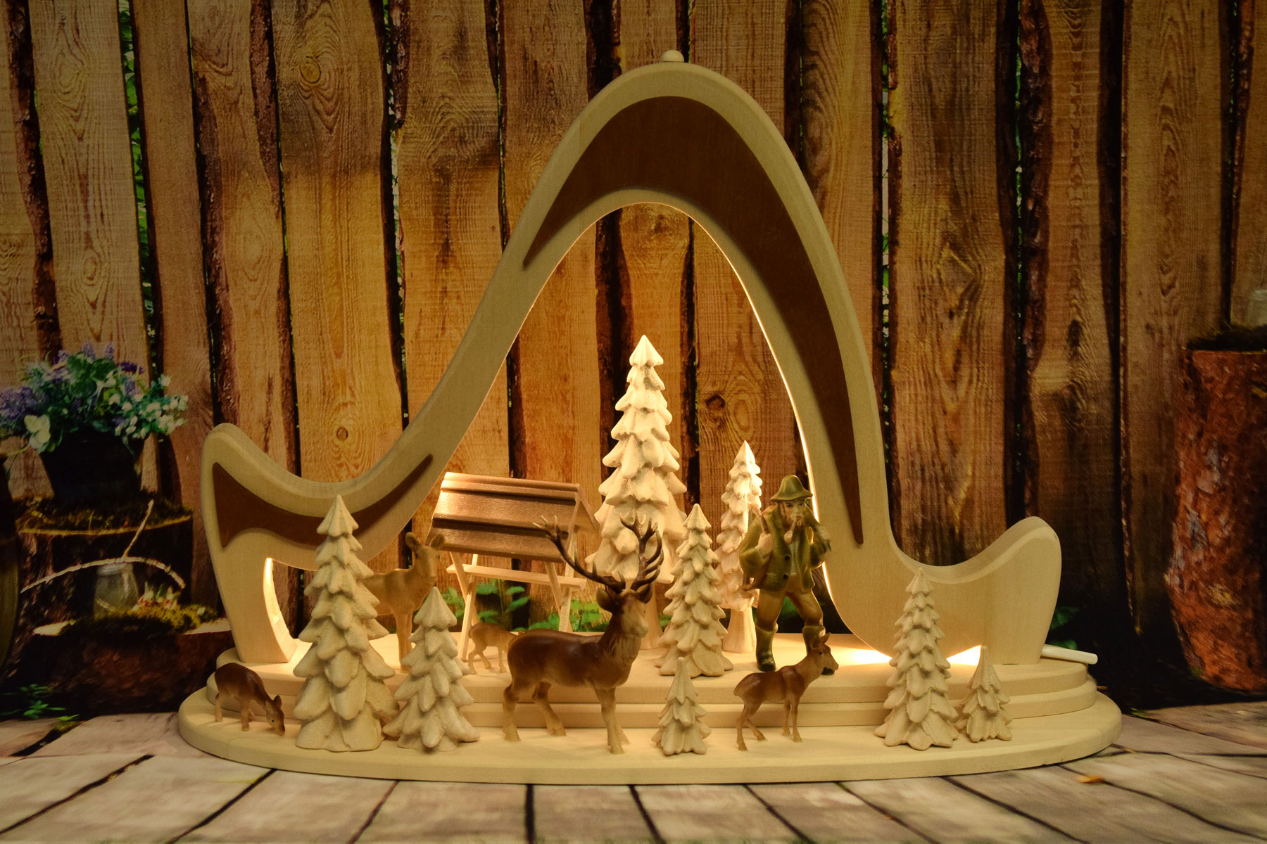Die besondere Wellenform des Massivholzbogens ist mit LED ausgestattet und zeigt neben handgeschnitzten Bäumen aufwändig geschnitzte Rehe, Hirsch, Futterkrippe und Förster mit filigraner Handbemalung.