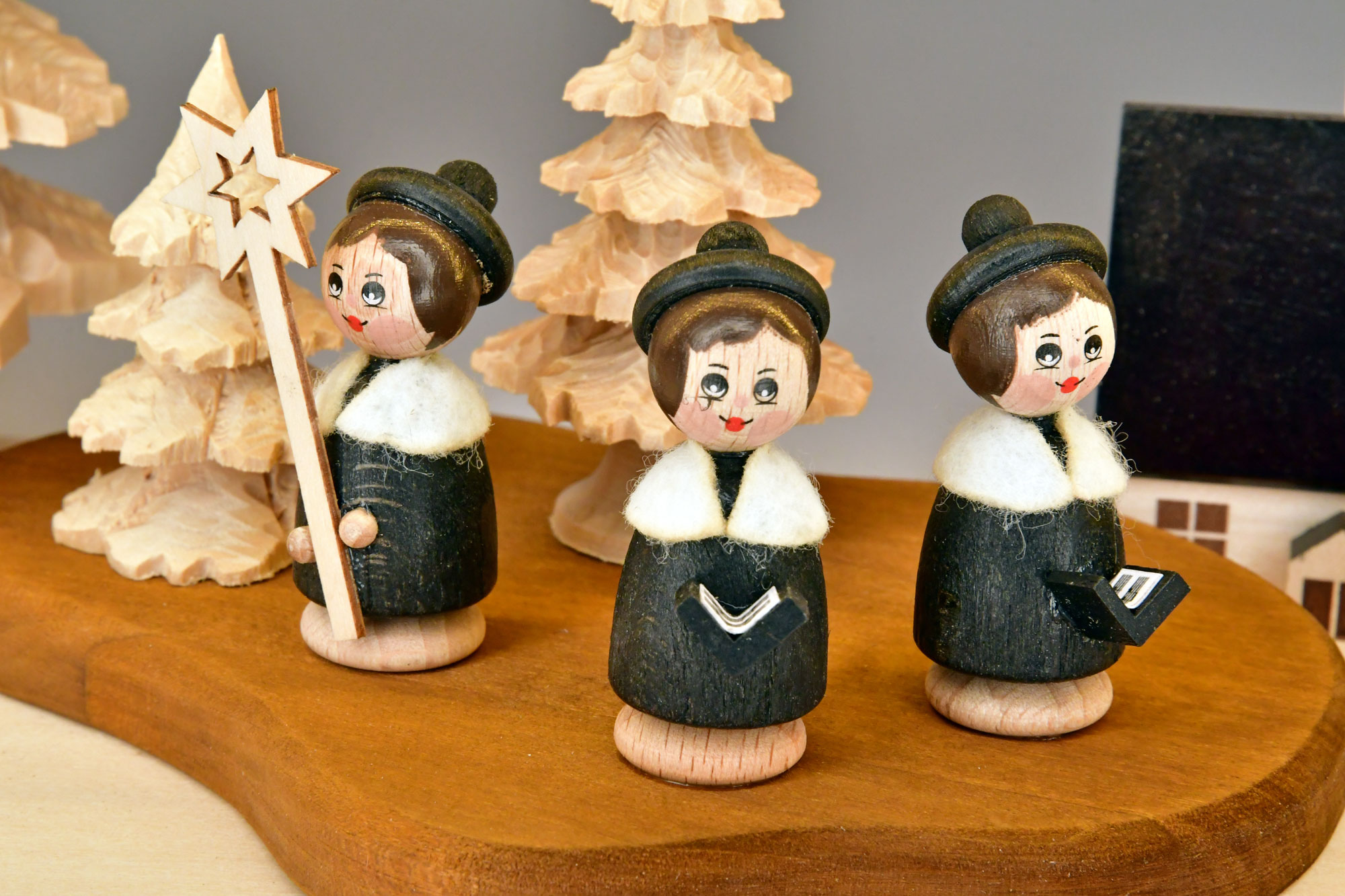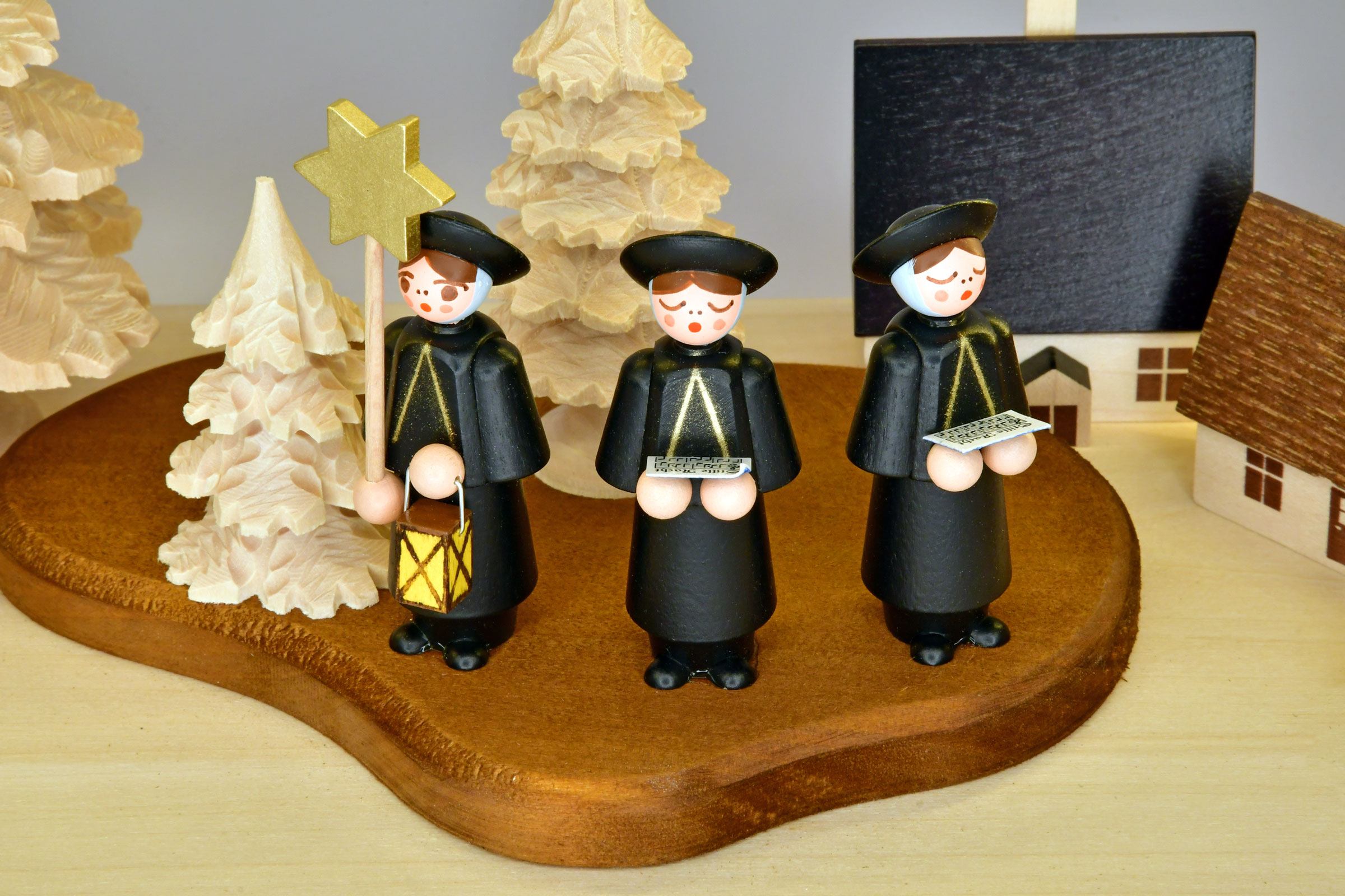 Moderner Massivholz-Schwibbogen aus dem Hause RATAGS mit aufgesetzten Zierleisten in Brauntönen. Ein Blickfang ist die Seiffener Kirche, das Wahrzeichen des Spielzeugdorfes Seiffen. Die Kurrendesänger wandern in der Weihnachtszeit von Haus zu Haus und erfreuen mit ihren Gesängen die Herzen der Menschen. Alle Figuren, die Bäume, die Kirche und Häuser sind aus Massivholz gefertigt und zum Teil farbig lasiert. Die blendfrei montierte LED-Beleuchtung erzeugt eine stimmungsvolle Atmosphäre.