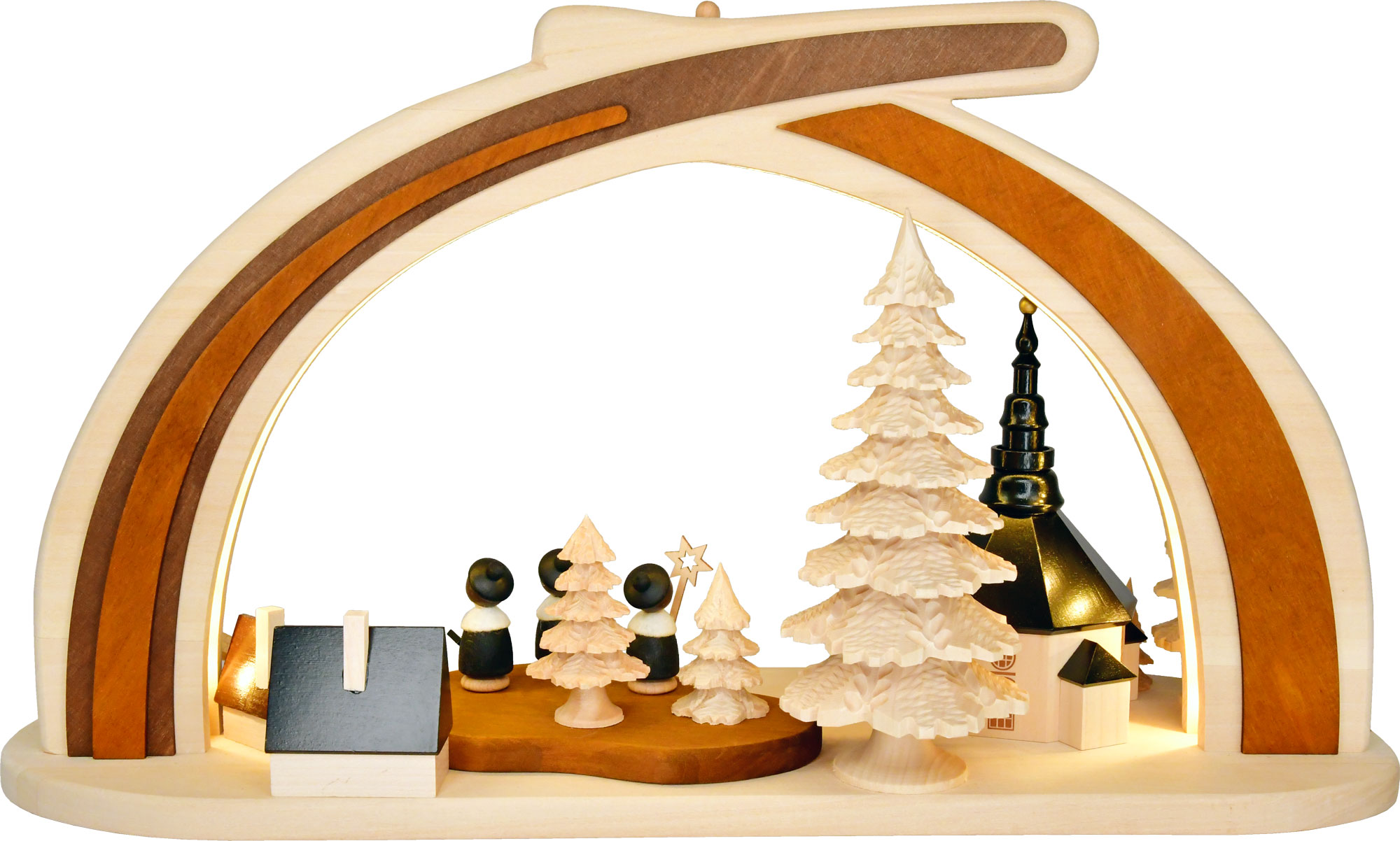 Produktinformationen "Massivholzbogen, Seiffener Kirche mit Kurrende, LED-Beleuchtung, Halb-USB"