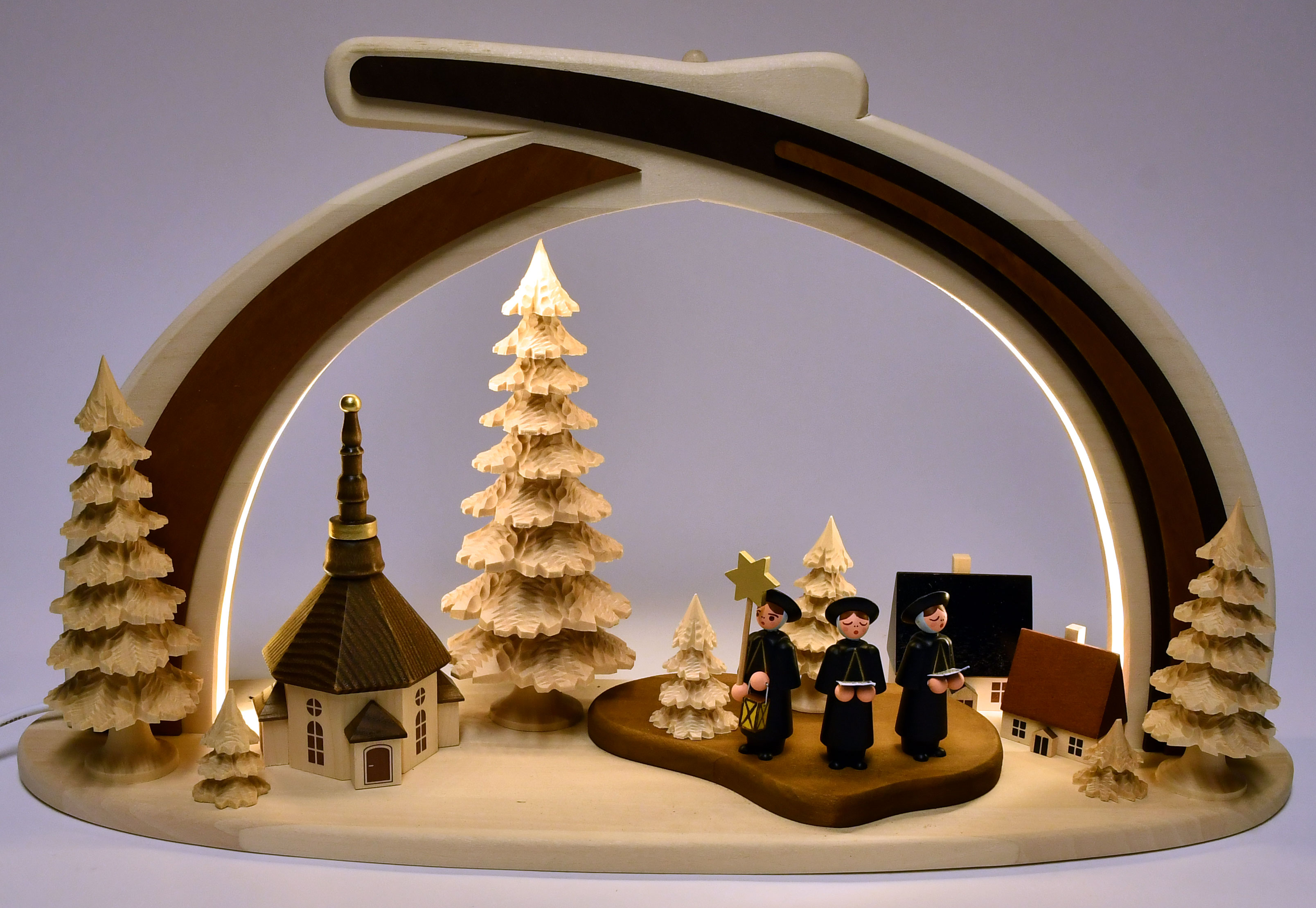 Massivholzbogen, Seiffener Kirche mit Kurrende, LED-Beleuchtung, Halb-USB