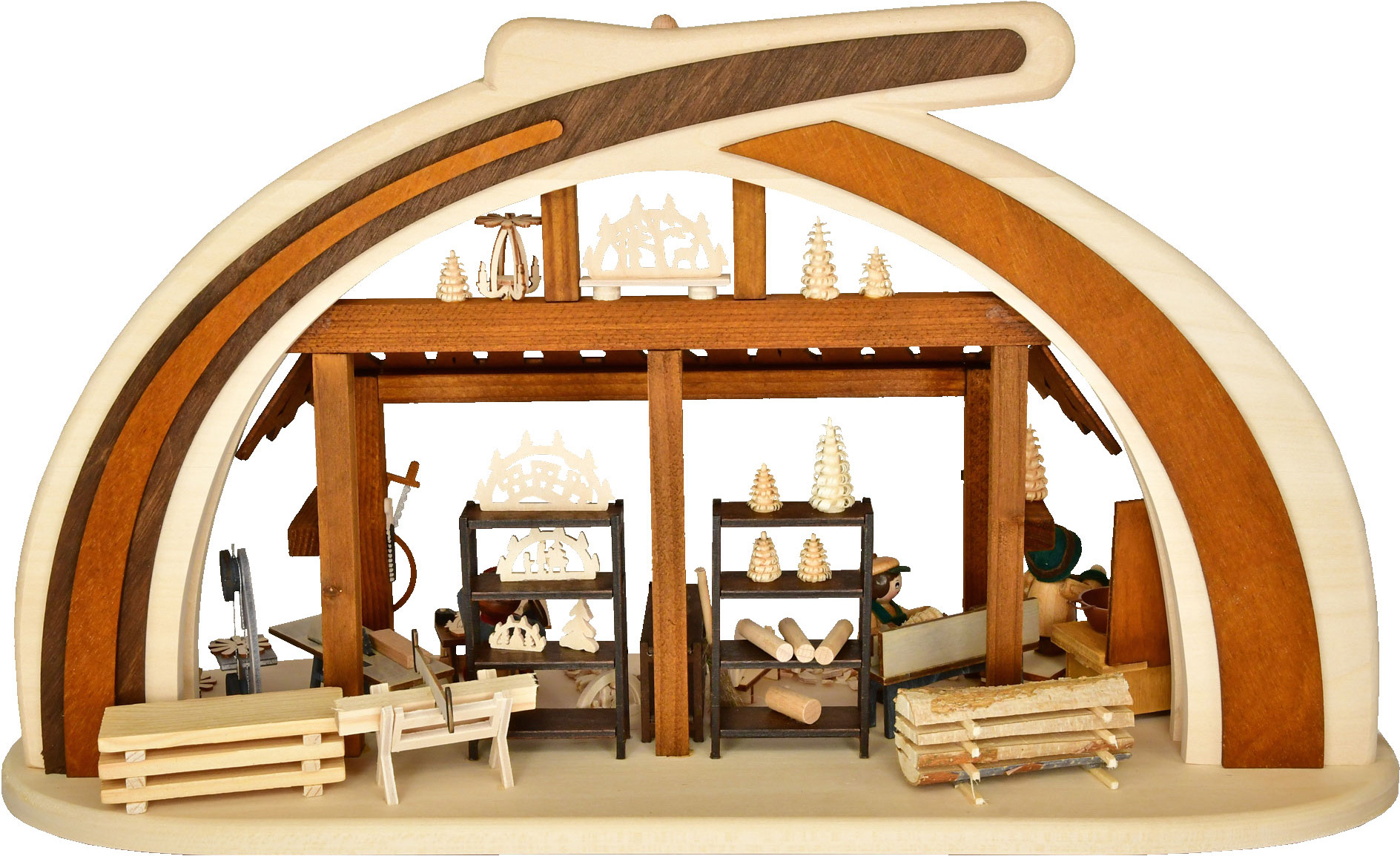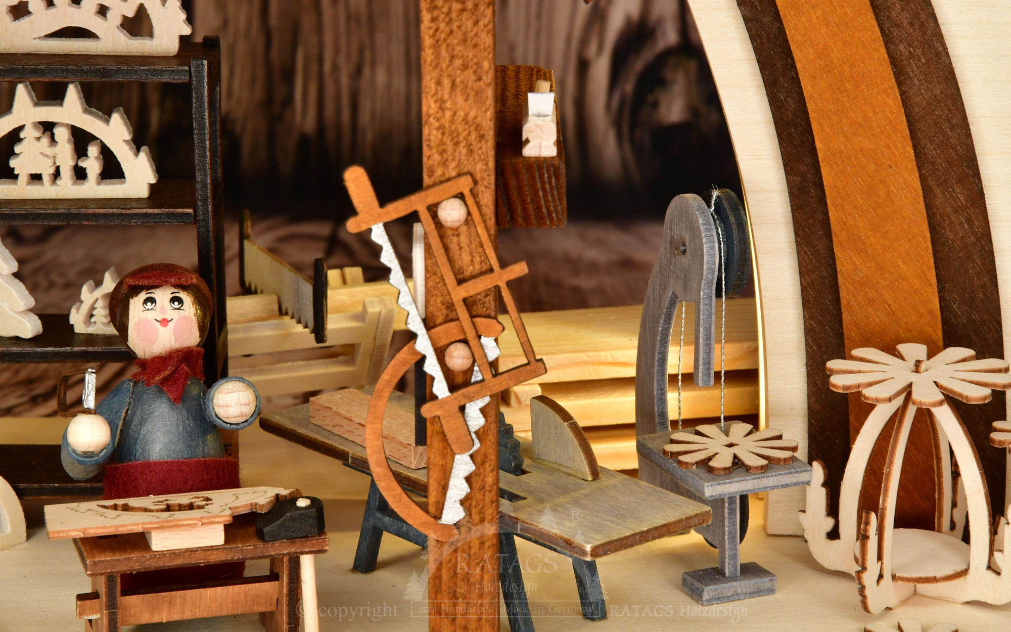 Ein reizender Massivholz-Schwibbogen aus dem Hause RATAGS. Mit außerordentlichem Detailreichtum wird die Arbeit in einer Tischlerwerkstatt dargestellt. Diese hat sich auf die Anfertigung von erzgebirgischer Holzkunst spezialisiert. An einer gut bestückten Werkbank sitzt ein Schnitzer, der offenbar an Figuren für Pyramiden und Schwibbogen arbeitet. An einer Drechselbank steht ein weiterer Mitarbeiter und stellt klassische Spanbäume her, während sein Kollege nebenan feinste Laubsägearbeiten ausübt. Auch eine Schrotsäge für gröbere Stücke, eine Bandsäge, ein Beil, ein Hobeleisen sowie mehrere Bügelsägen und diverses Handwerkszeug gehören in eine gut eingerichtete Tischlerei. Überall stehen Rohprodukte, Zubehör und Materialien, die für die weitere Produktion benötigt werden. Der Kehrbesen steht bereit, um am Feierabend die anfallenden Holzabfälle und Hobelspäne aufzukehren. Gemütlich überdacht und mit repräsentativen Ausstellungsstücken geschmückt, wird diese hübsche Tischlerei vollendet beleuchtet von einem blendfrei montierten LED-Sripe. Alle Figuren sind in Massivholz ausgeführt. Dieser Schwibbogen ist ein Hingucker und wird die Herzen aller Liebhaber des erzgebirgischen Handwerks höher schlagen lassen.