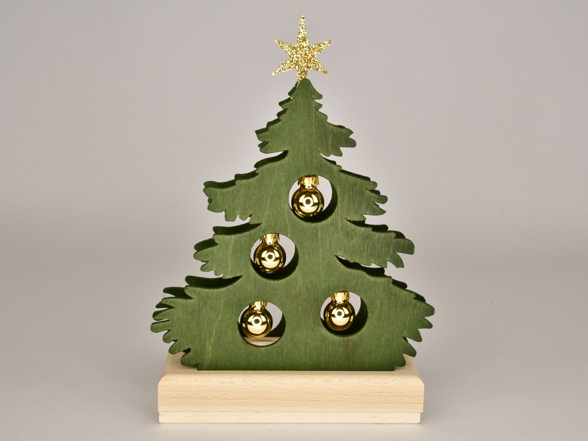 Dekorative Tanne aus Birkensperrholz mit echten Glaskugeln. Die blendfrei verbaute LED-Beleuchtung verbreitet ein stimmungsvolles Licht. Die Tanne ist grün gebeizt. Die USB-Stromversorgung kann per Powerbank erfolgen und ermöglicht so eine netzunabhängige Aufstellung.