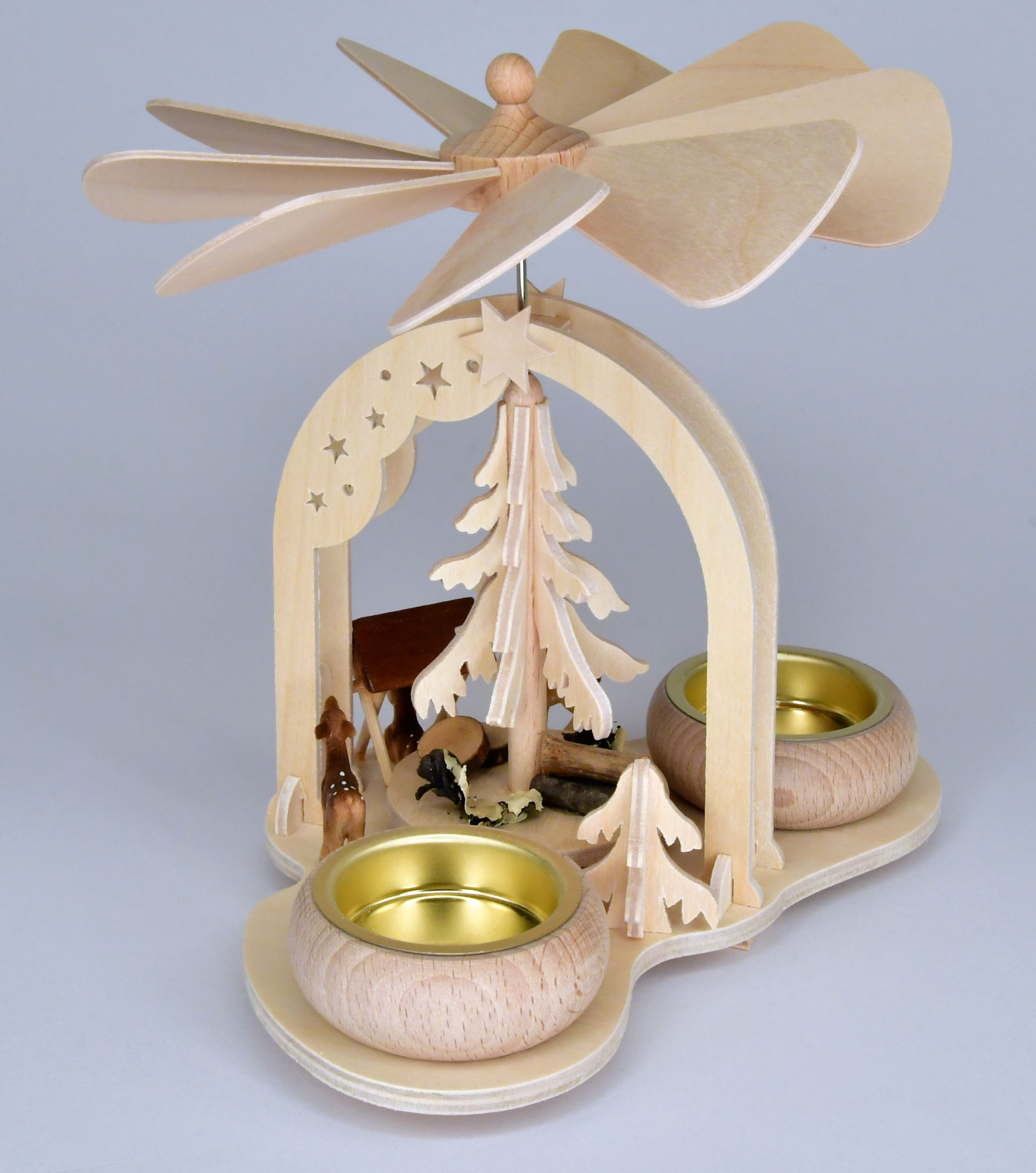 Schöne Minipyramide mit einem Bäumchen in der Mitte und Rehen. Angetrieben wird die Pyramide durch zwei angezündete Teelichter, die in die vorgesehenen Massivholzteelichthalter platziert werden.