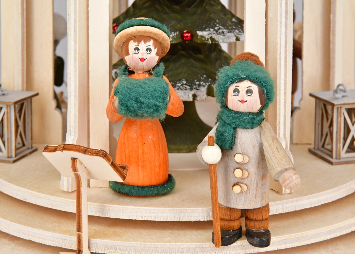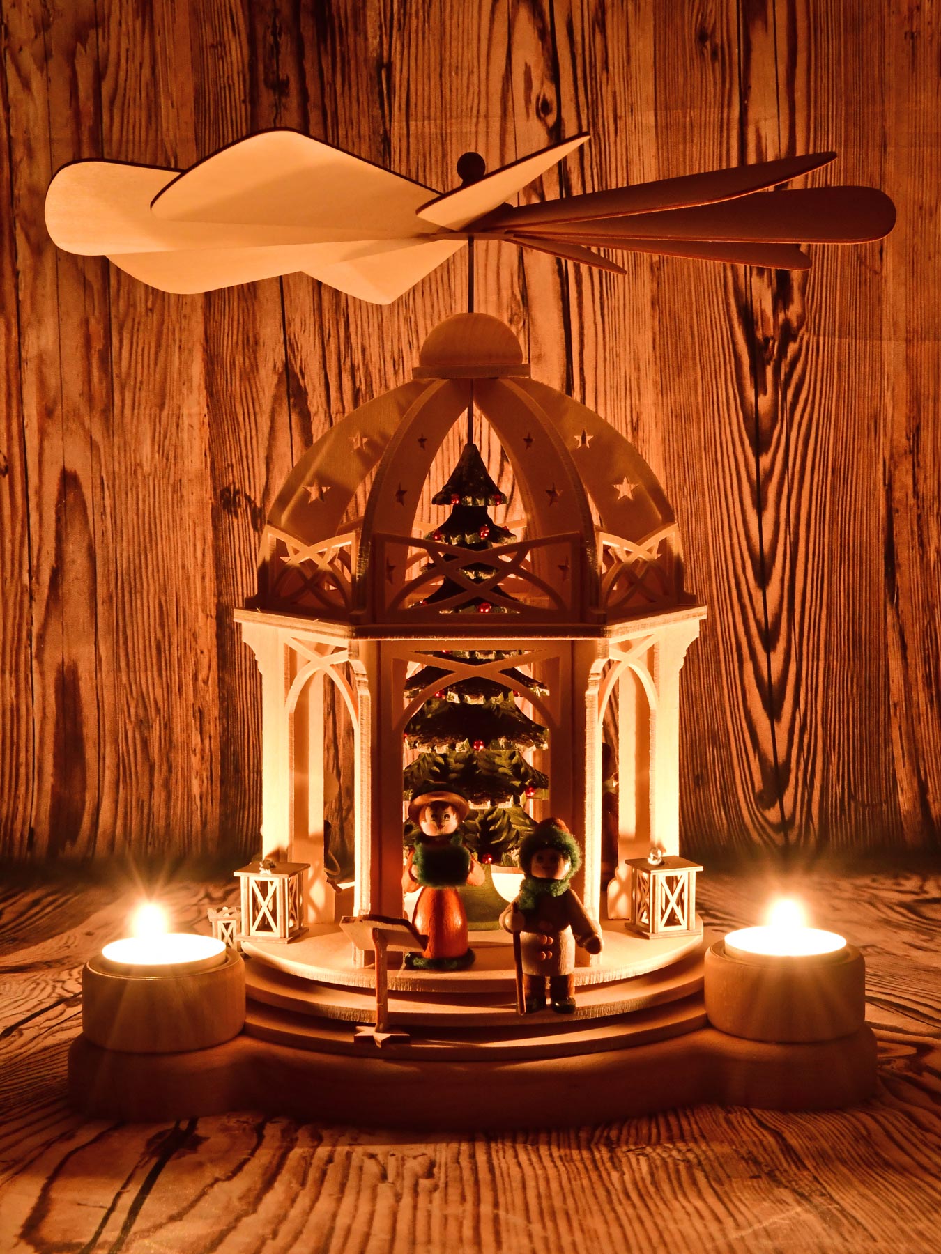 Eine RATAGS-Tischpyramide mit einer völlig neuen Form: Im Stil eines englischen Pavillons erscheint die durchbrochene Architektur und gibt den Blick frei auf einen im Inneren drehenden, geschmückten Weihnachtsbaum. Eine Treppe mit drei Stufen führt zum Pavillon empor. Gleich vier Massivholzfiguren mit zwei Hündchen beleben diese erzgebirgische Handarbeit. Angetrieben wird die Pyramide durch drei Teelichte.