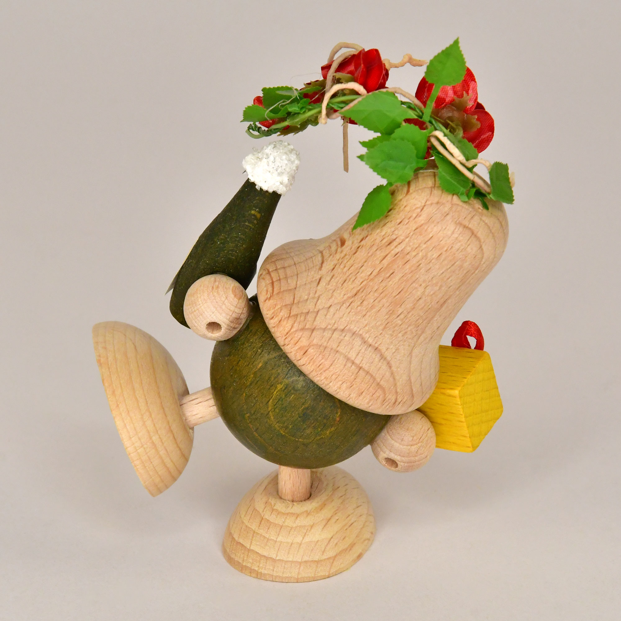 Unser Wunsch-Rats "Gute Besserung" wurde mit Rose, Weinflasche und Geschenk verziert. Hut und Füße wurden tannengrün gebeizt.