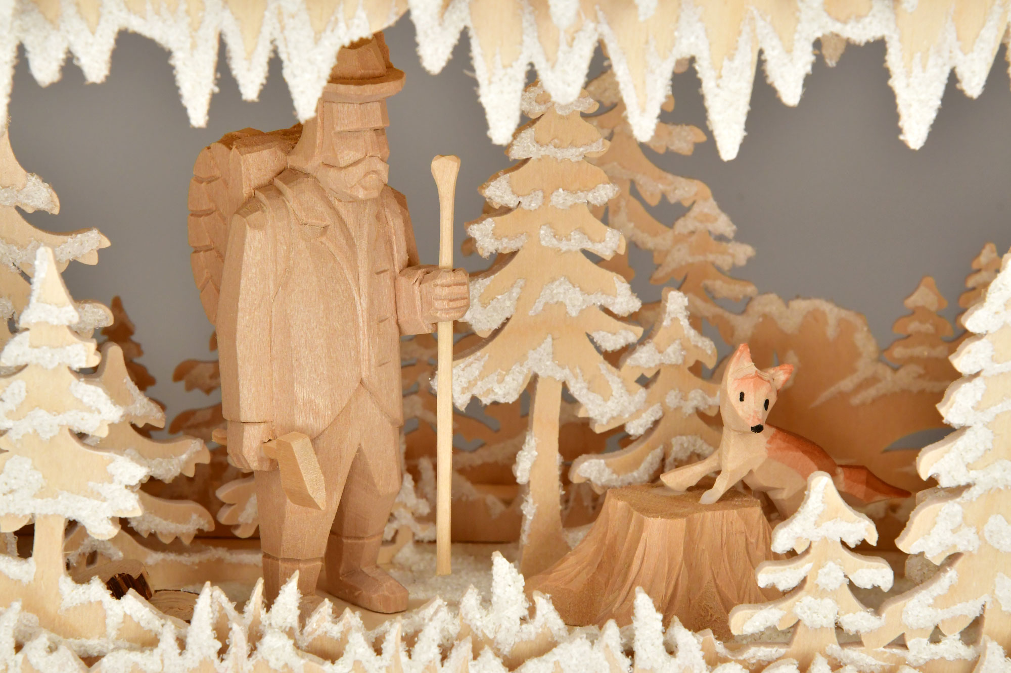 Zwischen Tälern und Wiesen verbirgt sich ein dichter Wald. Ab und an durchforstet der geschnitzte Waldmann mit seiner Axt dieses Gebiet. Heute wird die Futterraufe mit Heu befüllt, damit die geschnitzten Rehe an diesem kalten Wintertag etwas zu Fressen haben. Auf dem Weg zur Raufe springt ein kleiner geschnitzter Fuchs auf einen Baumstumpf und beobachtet den Förster voller Neugier. Den gewissen Charme verleiht die indirekte LED-Beleuchtung oberhalb der herabhängenden Eiszapfen und der von Hand aufgebrachte Raureif.