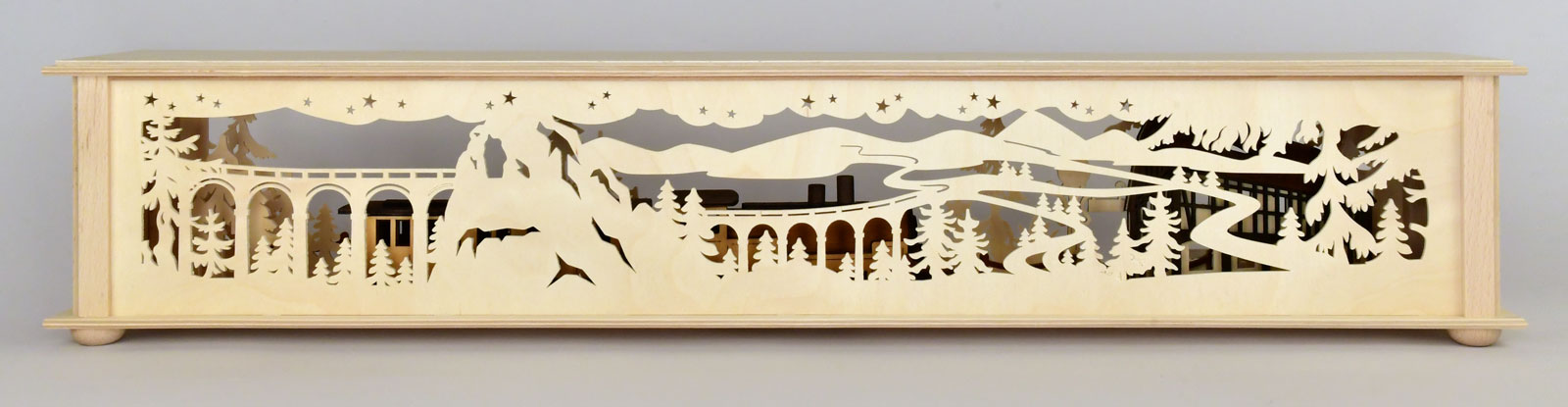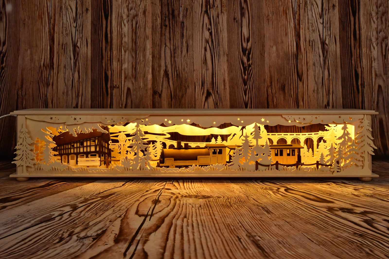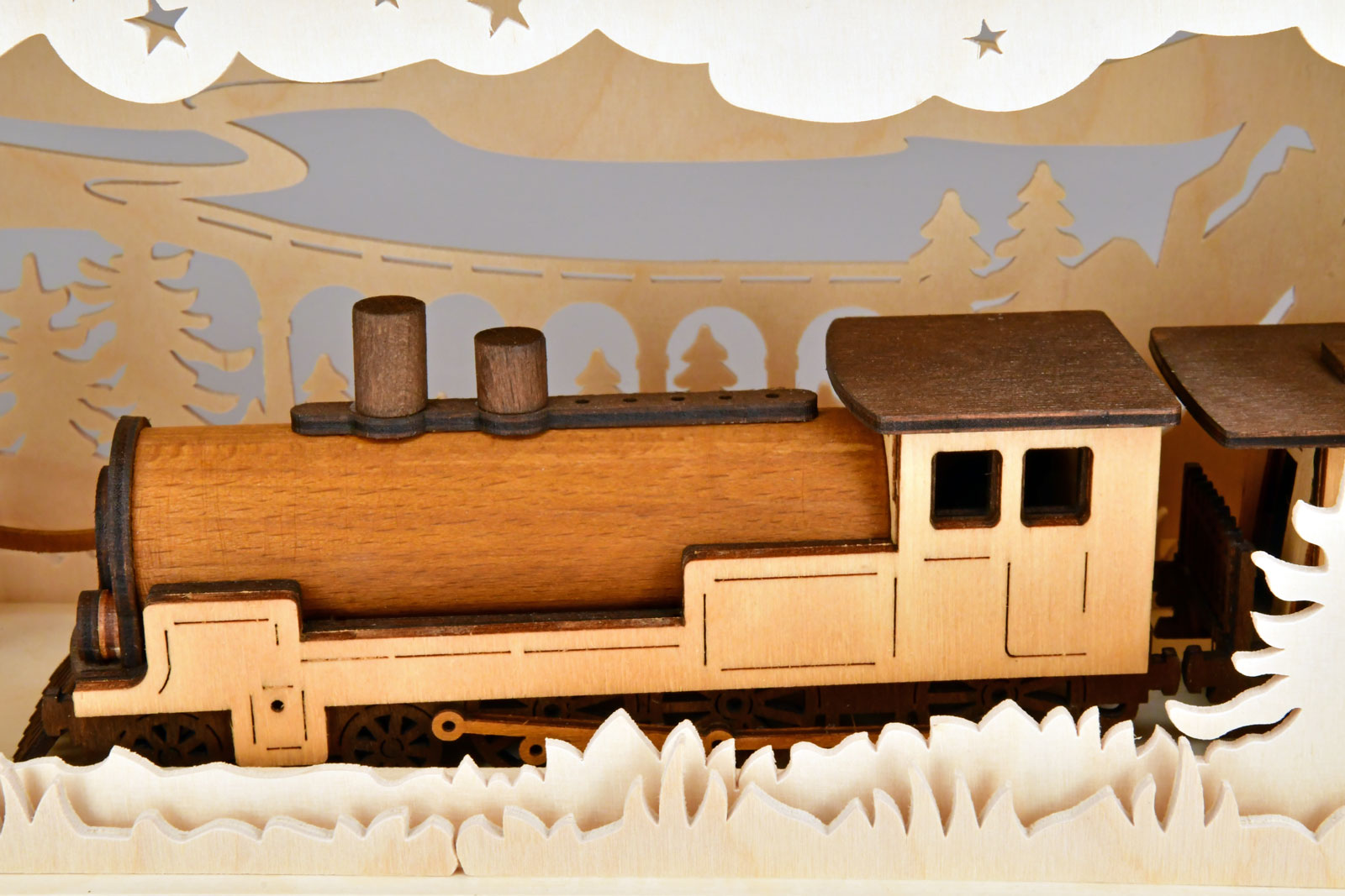 Ein kleiner Bahnhof vor einer alpinen Landschaft mit zwei Eisenbahnbrücken und hohen Bergen in der Ferne. Eine große Dampflok mit einem Personenwagen kommt gerade eingefahren. Die Lok ist mit einem Massivholzkessel ausgestattet und wie der Anhänger farbig gebeizt. Ein Umgebindehaus steht hinter dem Bahnsteig mit einer Bahnhofsuhr. Ein Motiv, das nicht nur die Herzen von Eisenbahnfans höher schlagen lässt. Die Raumleuchte ist geeignet für große RATAGS-Schwibbogen in Natur mit gebeizten Elementen. Sie ist mit einer indirekten LED-Beleuchtung ausgestattet und erzeugt eine stimmungsvolle Raumatmosphäre.