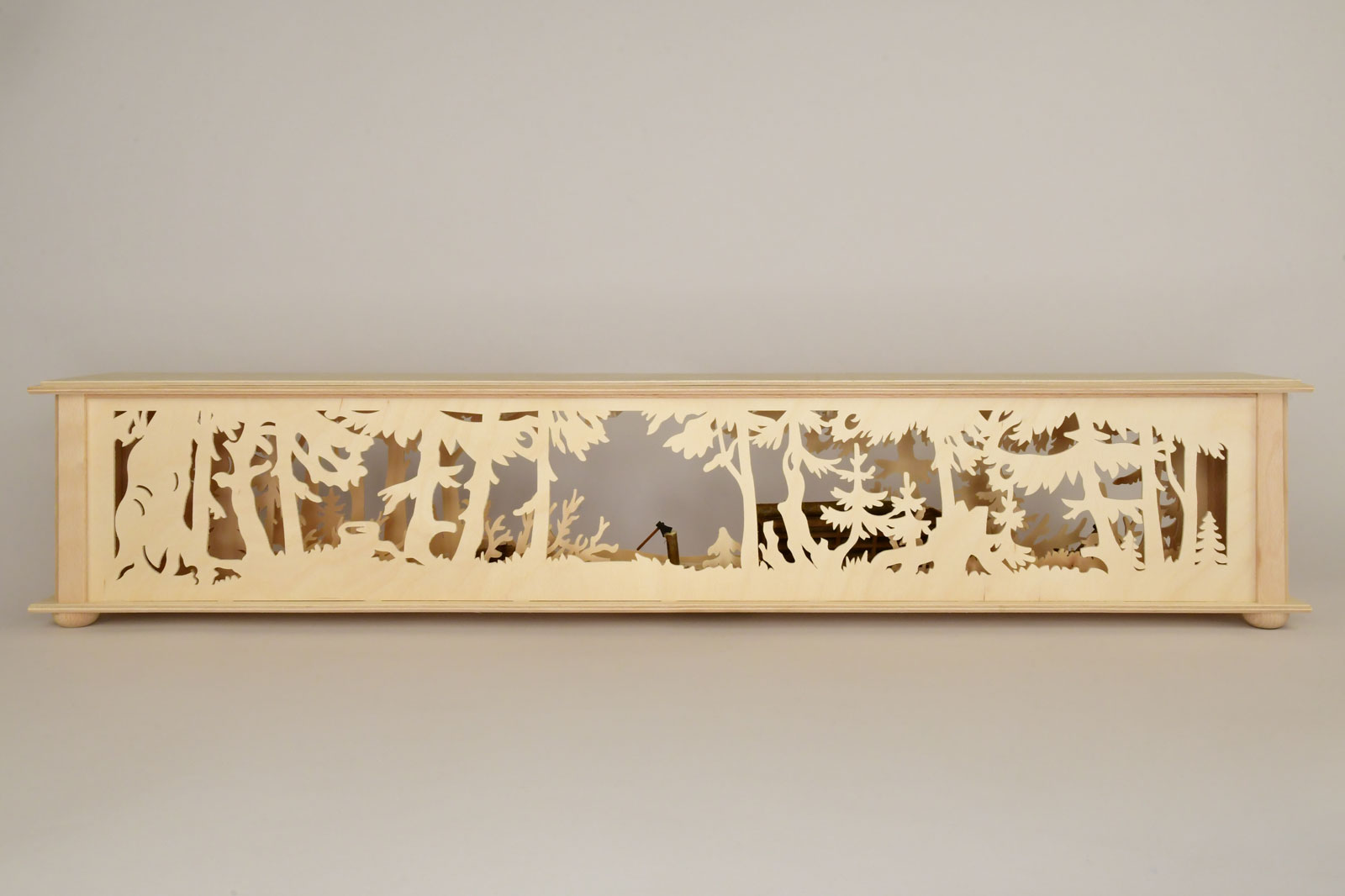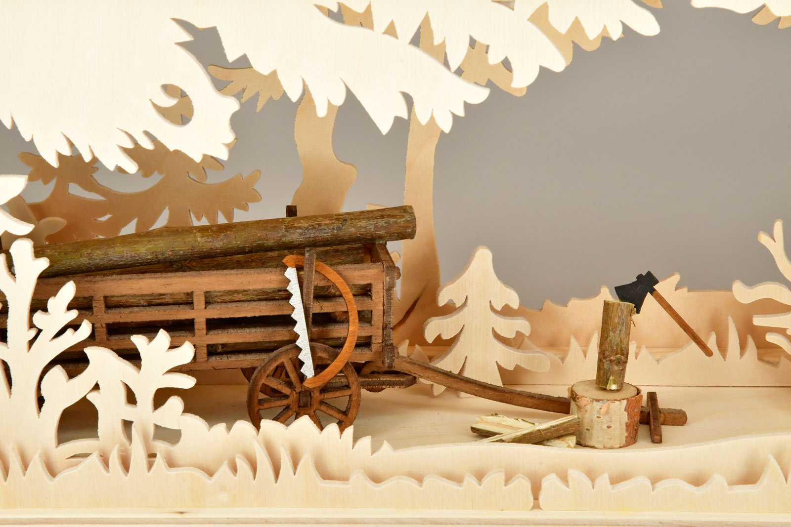Die Arbeit des klassischen Holzfällers wird in dieser Raumleuchte dargestellt. Die benötigten Werkzeuge liegen griffbereit am Holzlagerplatz im Wald. Ein Holzwagen ist bereits mit Baumstämmen beladen und wartet auf die Abholung. Die Raumleuchte ist geeignet für große RATAGS-Schwibbogen in Natur mit gebeizten Elementen. Sie ist mit einer indirekten LED-Beleuchtung ausgestattet und erzeugt eine stimmungsvolle Raumatmosphäre.