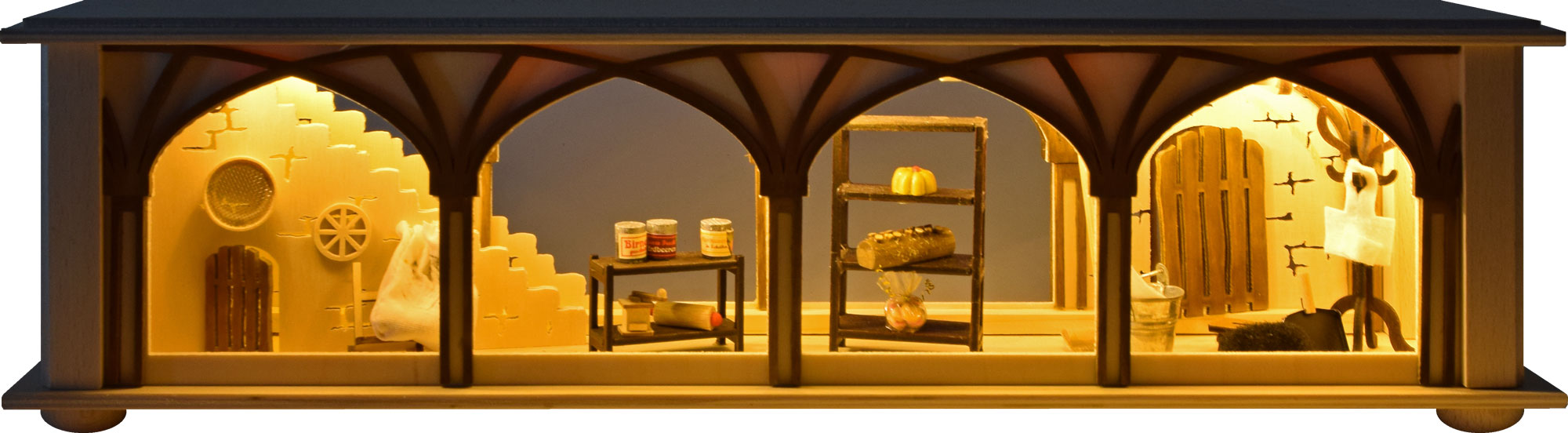 Diese Raumleuchte wurde in Form einer Mehlkammer gefertigt. Jeder Bäcker und Konditor ist froh über eine solche. Vorräte, wie Mehl Salz, Zucker und andere Gewürze werden in dem Keller gelagert. Aber auch Backutensilien, Töpfe und Pfannen finden dort bis zu ihrem nächsten Einsatz seinen Platz. Ein Kätzchen passt auf, dass die Mäuse nicht an den Vorrat gehen. Der Gewölbekeller bekommt durch indirektes LED-Licht einen ganz besonderen Flair.