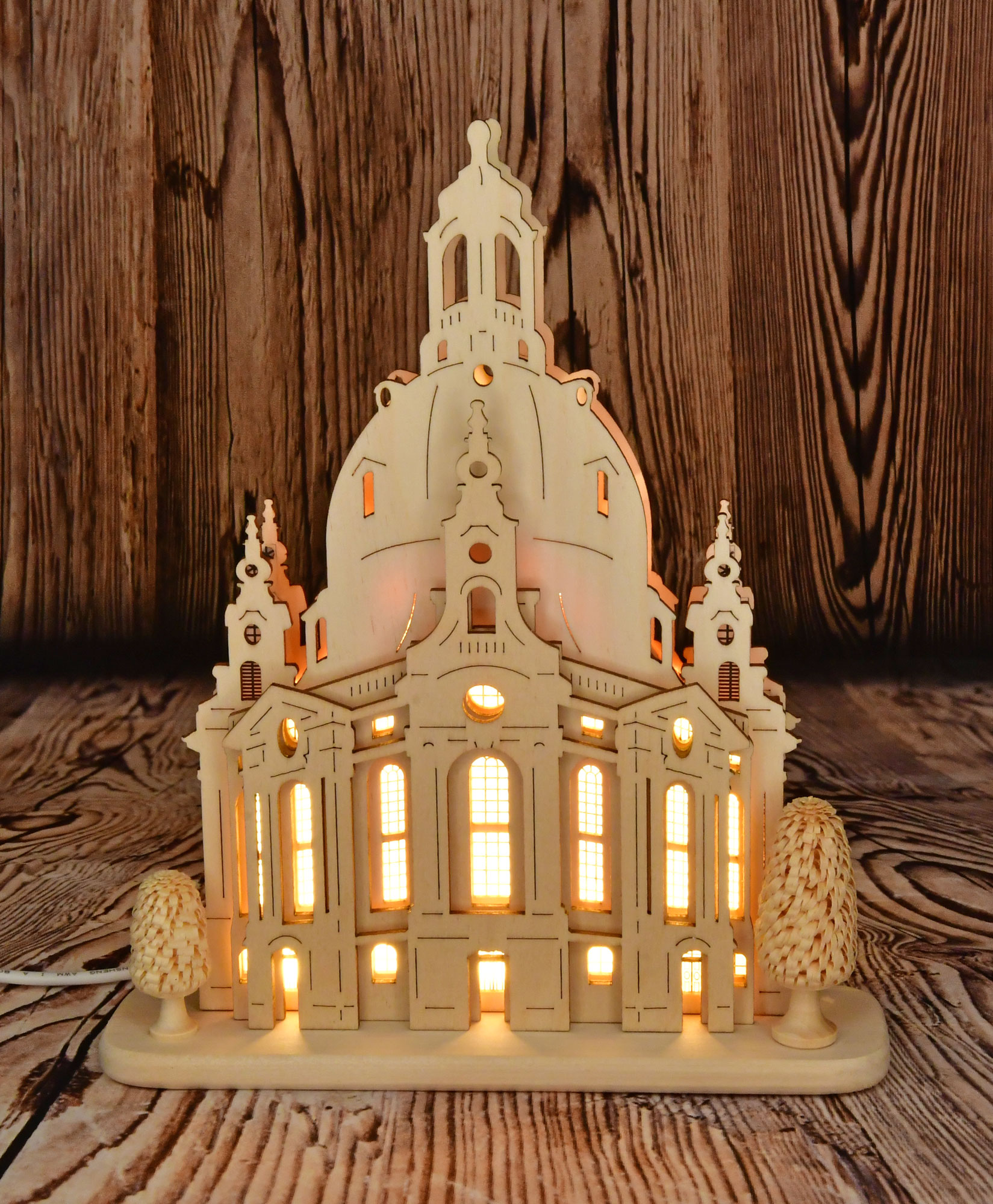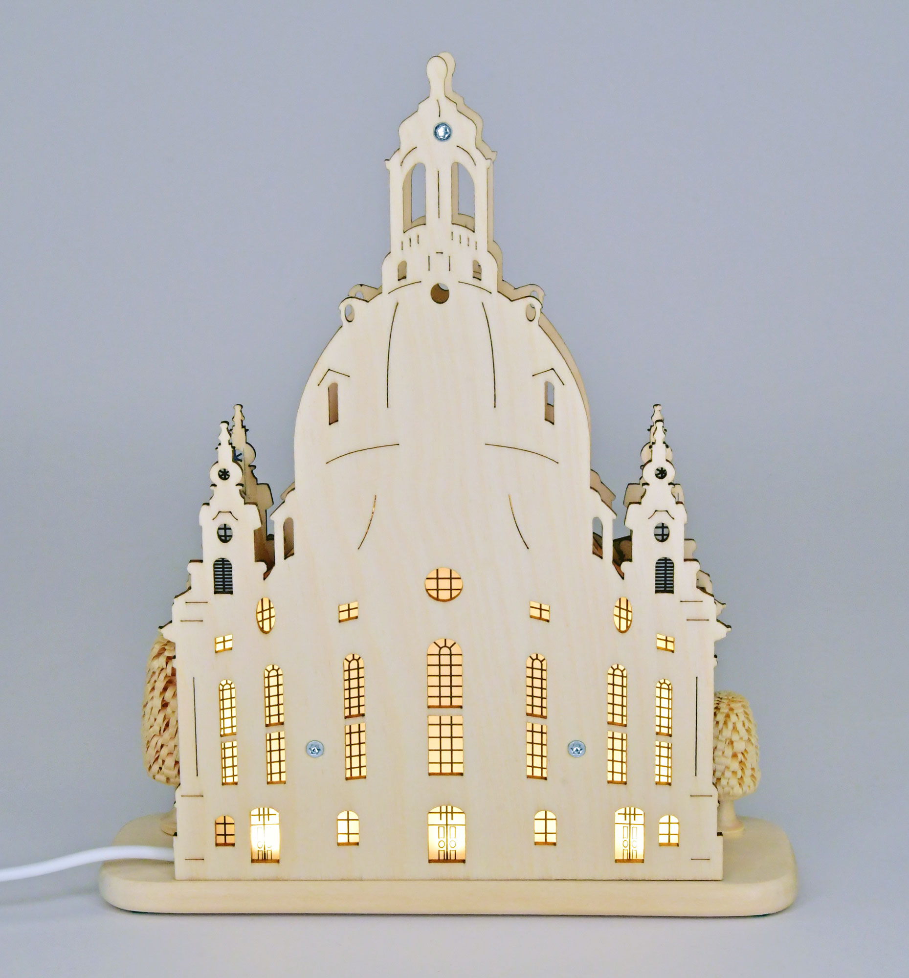 Darstellung der Dresdner Frauenkirche am Neumarkt in Birkensperrholz mit integrierter LED-Beleuchtung. Die USB-Stromversorgung ermöglicht z. B. per Powerbank eine dezentrale oder mobile Aufstellung. Ein echter Hingucker und ein großartiges Souvenir aus dem Hause RATAGS