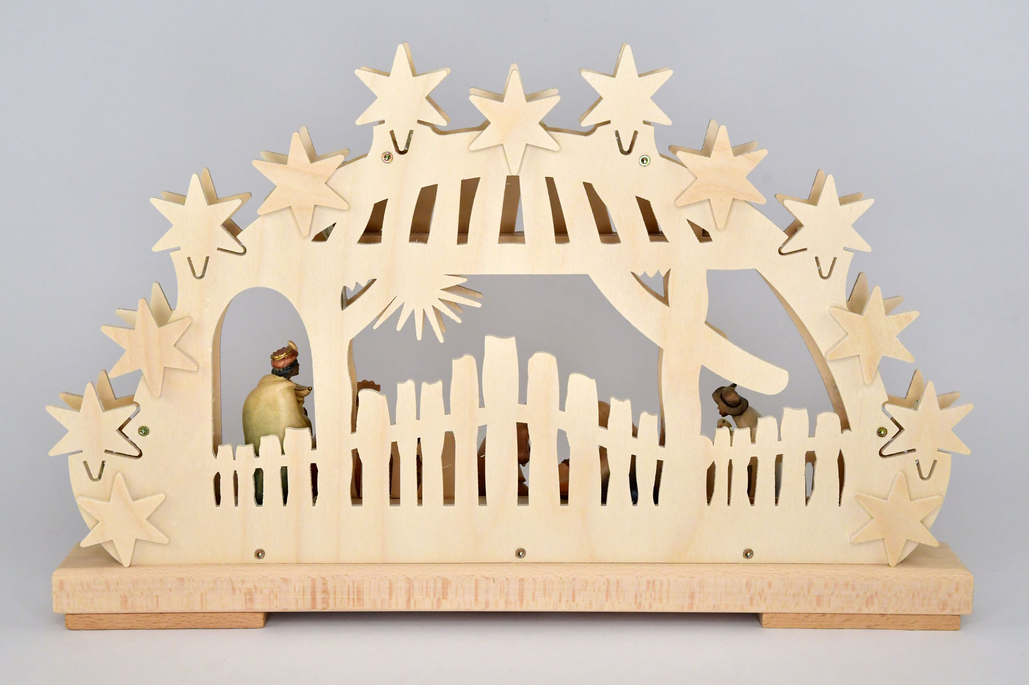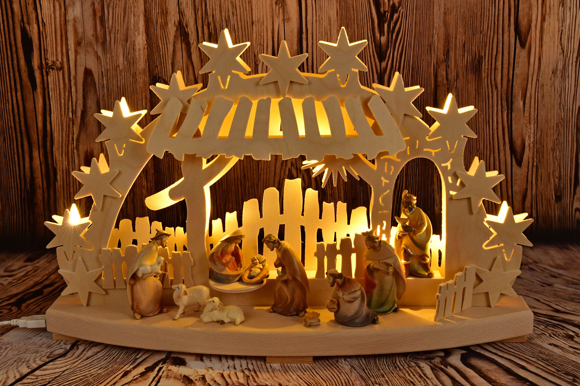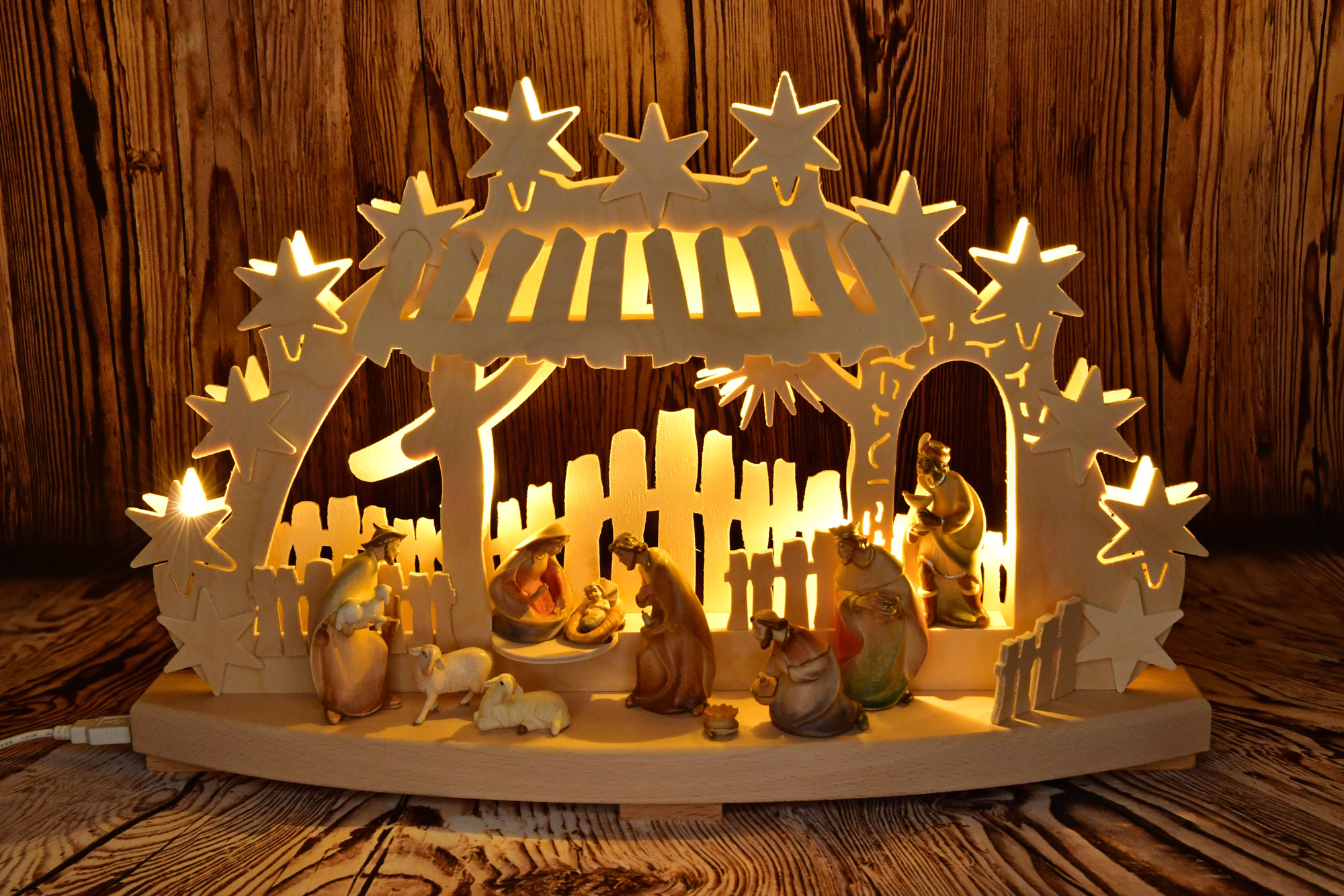 Ein Klassiker: Christi Geburt, dargestellt im Schwibbogen. Aber auf das WIE kommt es an! Echte Tiroler Figuren aus Handarbeit und farbig coloriert! Im Zentrum des naturbelassenen Schwibbogens ist die Geburtsszene zu erleben. Die Hirten waren die ersten Gäste, später folgen die Könige aus dem Morgenland, um dem Christkind Geschenke darzubringen. Maria und Joseph können ihr Glück kaum fassen. Und all das geschieht in einem Stall in Bethlehem! Eine neue Zeit bricht an.