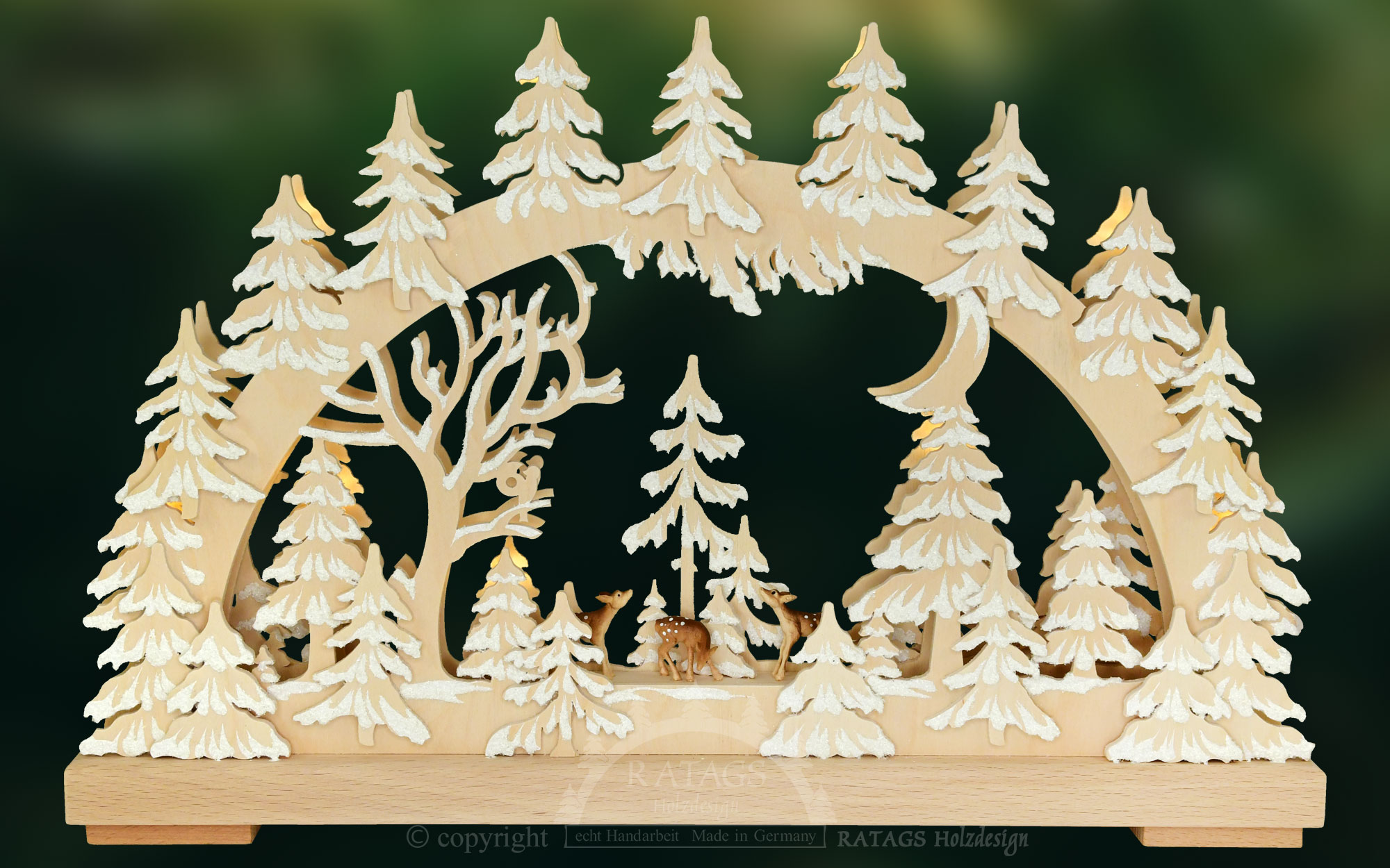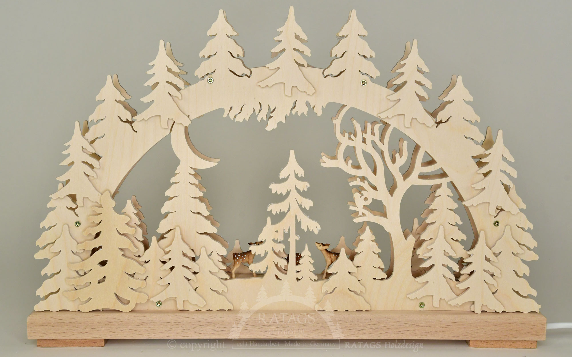 Der Mond ist schon aufgegangen, da traut sich das Rehwild aus dem Wald auf die Lichtung, um zu äsen. Blickfang dieses naturbelassenen und romatisch mit LED beleuchteten Doppelschwibbogens sind die liebevoll von Hand geschnitzten und bemalten Rehe. Über ihnen, hoch oben im Geäst der aus 3 mm starkem Birkensperrholz gesägten Bäume hämmert ein Specht. Die idyllische Waldstimmung macht diesen Lichterbogen zu einem idealen Geschenk für Naturfreunde. Unser Doppelschwibbogen wurde in liebevoller Handarbeit mit frostigem Raureif verziert.