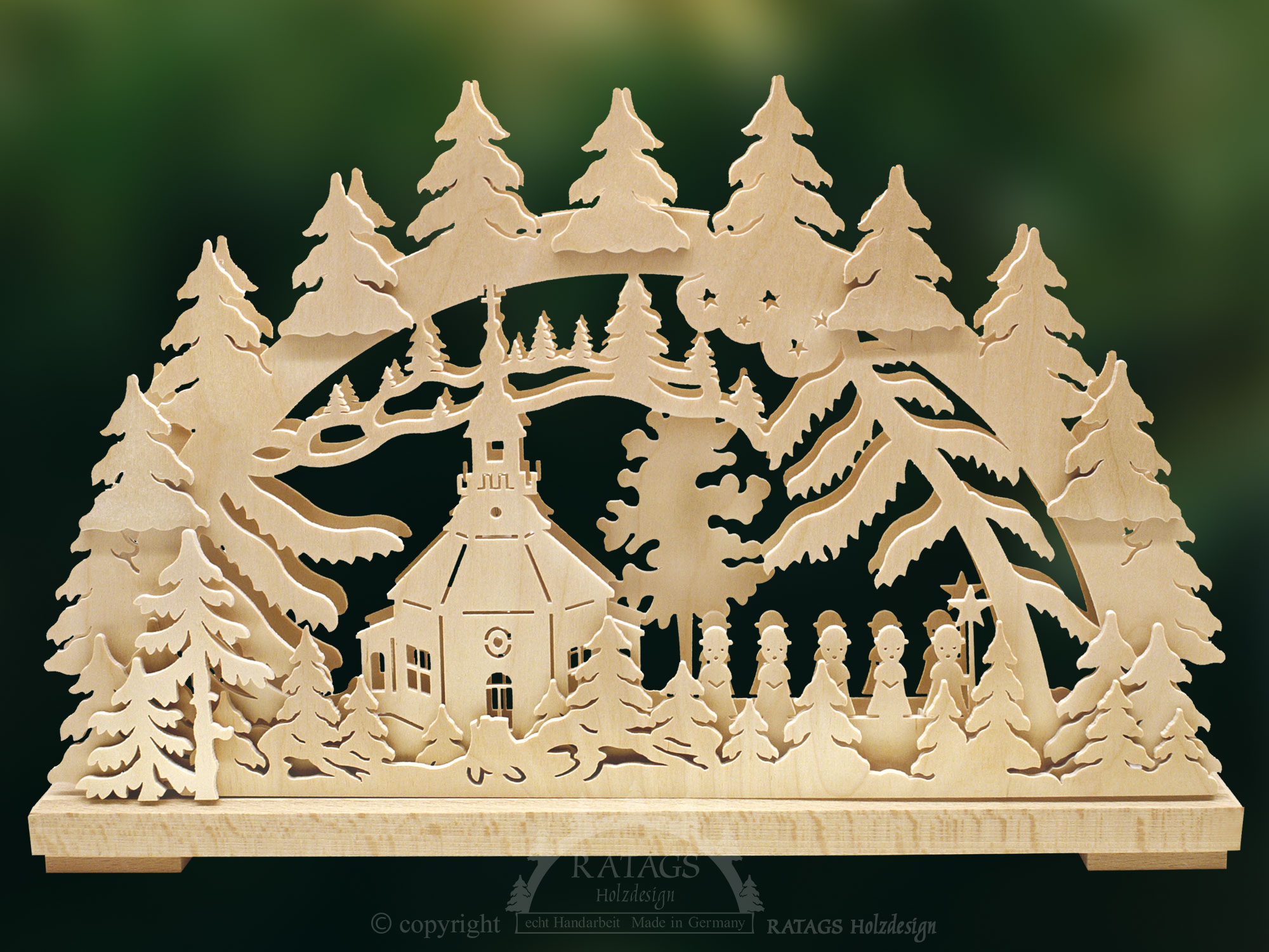 Die Seiffener Kirche ist das Wahrzeichen des Ortes und mit den Kurrendesängern ein beliebtes Motiv der erzgebirgischen Volkskunst. Dieser indirekt mit LED beleuchtete Doppelschwibbogen ist eine schlichte und schöne Laubsägearbeit aus 3 mm Birkensperrholz.
