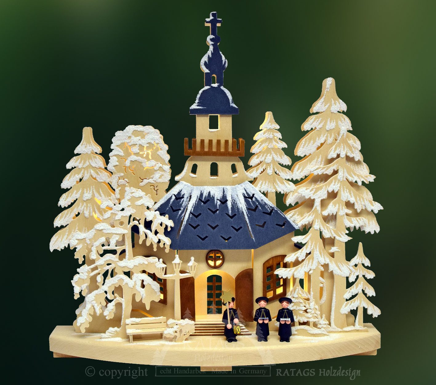 Dieser kleine 3D-Schwibbogen zeigt die Seiffener Kirche als Symbol des Erzgebirges. Eine indirekte LED-Lichterkette sorgt für eine stimmungsvolle Beleuchtung. 3 Kurrendesänger sind im Vordergrund platziert. Inmitten der naturbelassenen Bäume stellt die farbige Bergkirche mit den Figuren einen schönen Blickfang dar. Gefertigt wurde diese erzgebirgische Handarbeit aus 3 mm starkem Birkensperrholz. Durch die Verzierung mit Rauhreif wirkt diese Variante des Lichterbogens besonders winterlich.