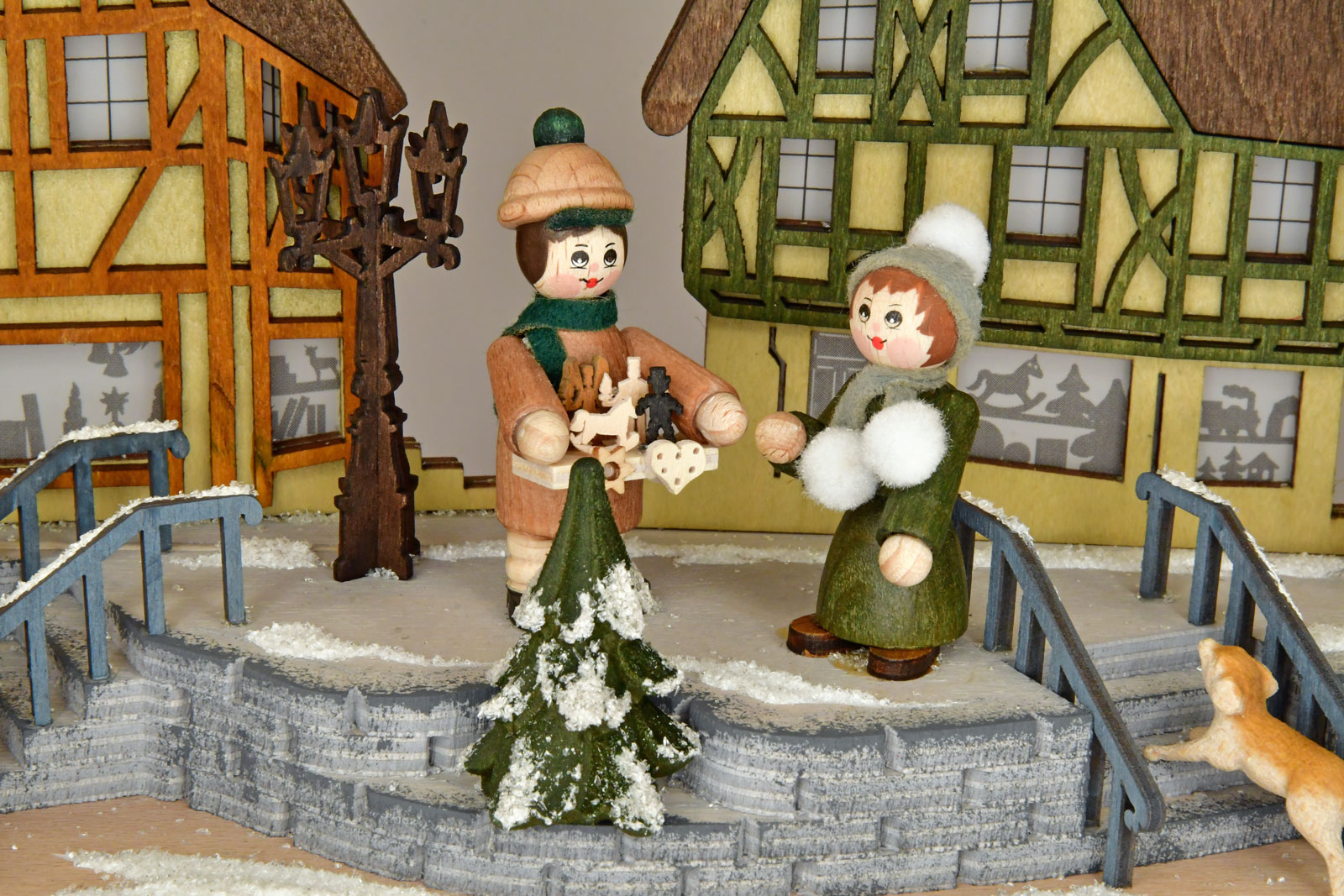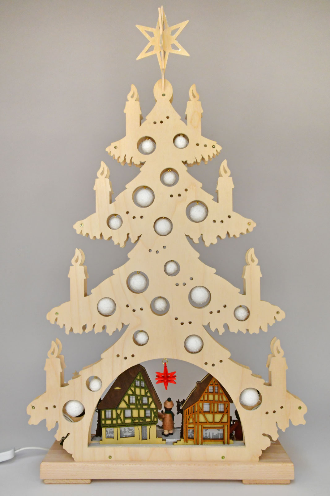 Das Zentrum dieser schönen Tanne aus Birkensperrholz bildet ein Dorfplatz, der von zwei farbigen Fachwerkhäusern mit Geschäften begrenzt wird. Ein Junge bietet einer Dame erzgebirgische Waren von seinem Bauchladen an. Ein Leierkastenmann sorgt für weihnachtliche Stimmung, passend zum roten Stern, der in der Mitte es Platzes einen farbigen Blickpunkt bildet. Ein munteres Hündchen springt die Treppe hinauf. Die Tanne ist mit weißen Schneekugeln geschmückt und mit frostigem Raureif von Hand verziert. Der Aufsatzstern ist abnehmbar. Die indirekte LED-Beleuchtung sorgt für eine stimmungsvolle Raumatmosphäre.