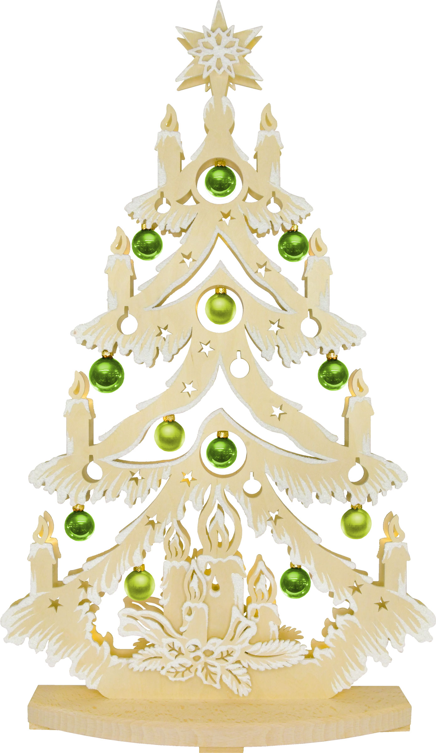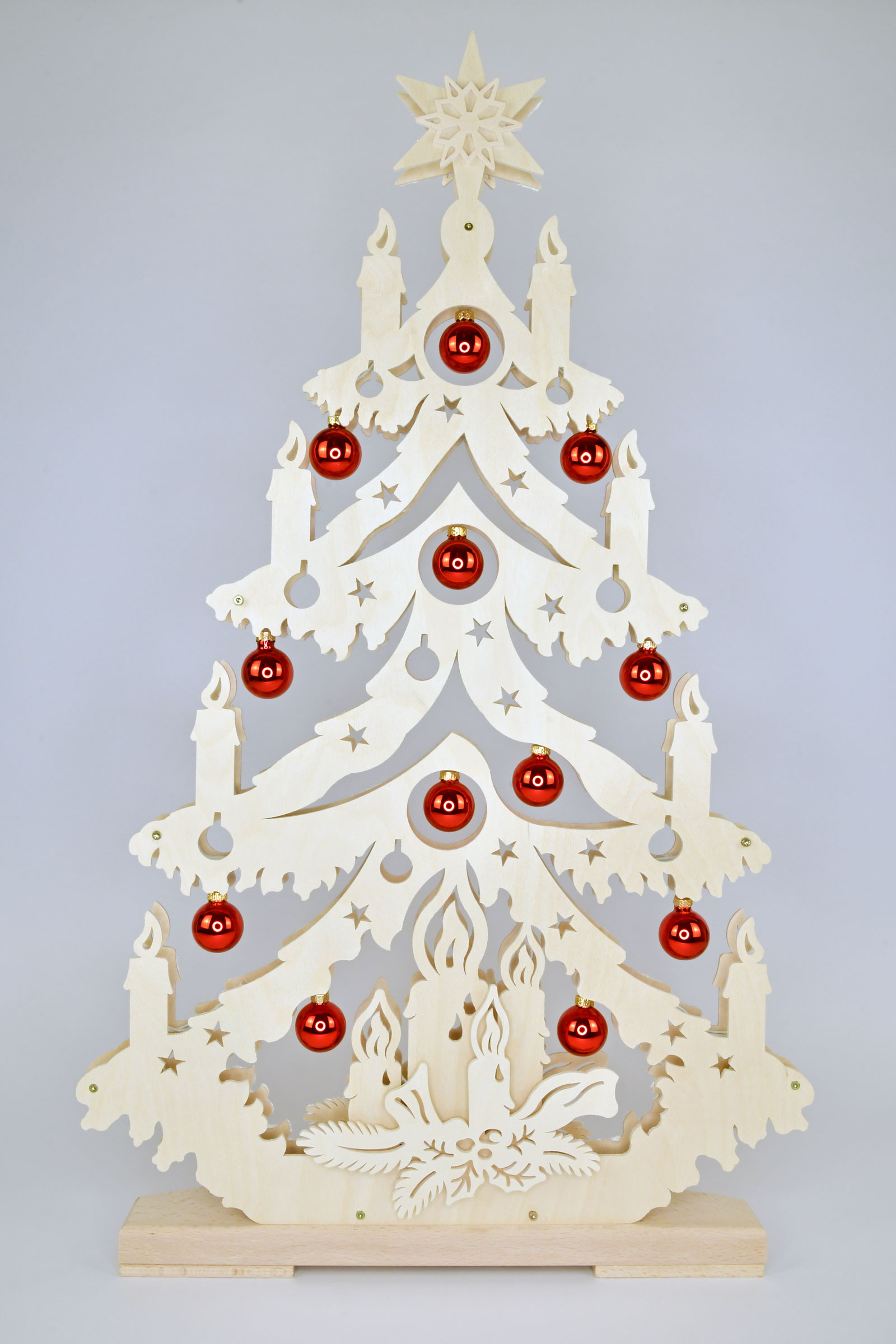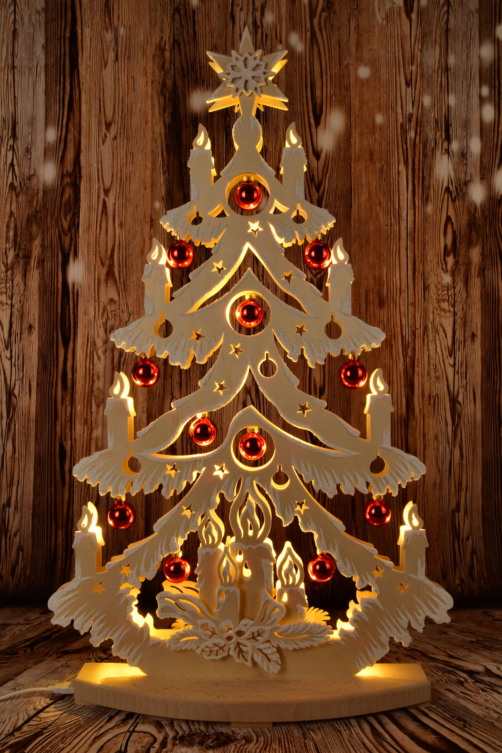 Voll im Trend sind unsere Kerzentannen mit je zwei Kugelsets. Je nach Belieben können die Baumkugeln getauscht werden. Ob nur rote, nur grüne oder bunt gemischte Kugeln Ihre Tanne zum Blickfang machen, ist ganz und gar Ihnen überlassen. Auch Adventskerzen dürfen in der Weihnachtszeit nicht fehlen. Sie erhellen den dunklen Abend und zählen die Wochen bis zur heiligen Nacht. Diese wunderschöne Tanne besitzt eine sparsame indirekte LED-Beleuchtung, die jeden Betrachter ins Staunen versetzt.