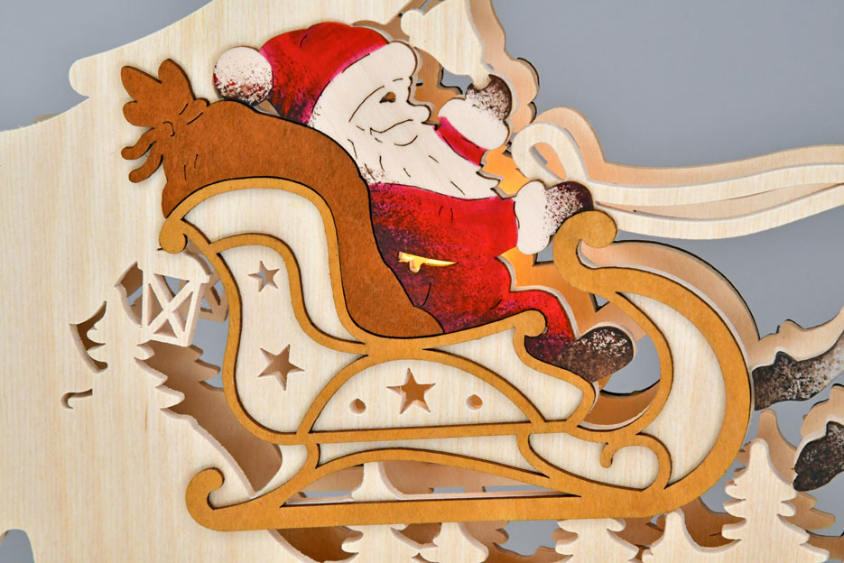 Im Zentrum dieser schönen RATAGS-Tanne fliegt das Rentiergespann des Weihnachtsmannes über ein kleines Dorf. Die Schornsteine rauchen behaglich, denn es ist Winter. Die Tanne ist mit Sternen geschmückt. Einzelne farbig gebeizte Elemente setzen Akzente als Kontrast zum hellen Birkensperrholz. Die indirekte LED-Beleuchtung sorgt für eine stimmungsvolle Raumatmosphäre. Die Stromversorgung erfolgt über eine USB-A-Schnittstelle und bietet damit eine hohe Flexibilität bei der Aufstellung.