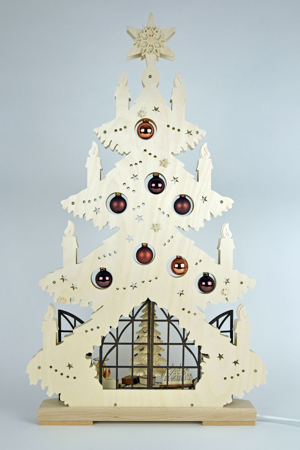 Eine liebevoll gestaltete Neuheit aus dem Hause RATAGS. Diese aufwändige Birkensperrholzarbeit zeigt eine weihnachtliche Stube. Vor einem stimmungsvollen Fenster steht ein geschnitzter Weihnachtsbaum. Ein Schwibbogen am Fenster und diverse Geschenke vervollständigen die Szenerie. Die edle Anmutung der Tanne entsteht aus der Verwendung ähnlicher Farbtöne, selbst der Kupferton der Baumkugeln passt sich ein in dieses warme Farbklima. Eine blendfrei verbaute indirekte LED-Beleuchtung sorgt für wunderbare Lichteffekte und wird Ihre Zimmer in eine Weihnachtsstube verwandeln. Ein schönes Stück erzgebirgischer Holzkunst für die dunkle Jahreszeit.