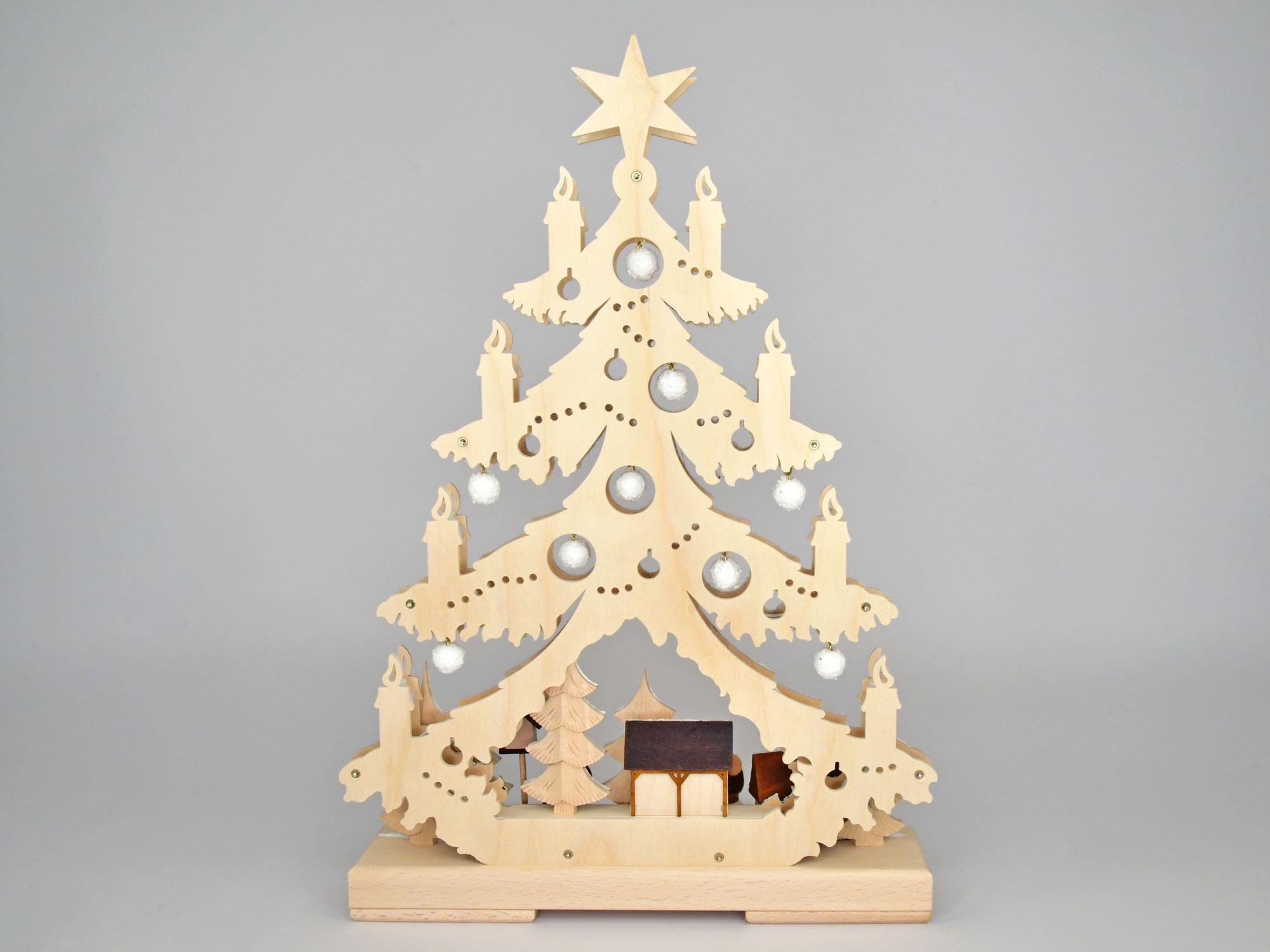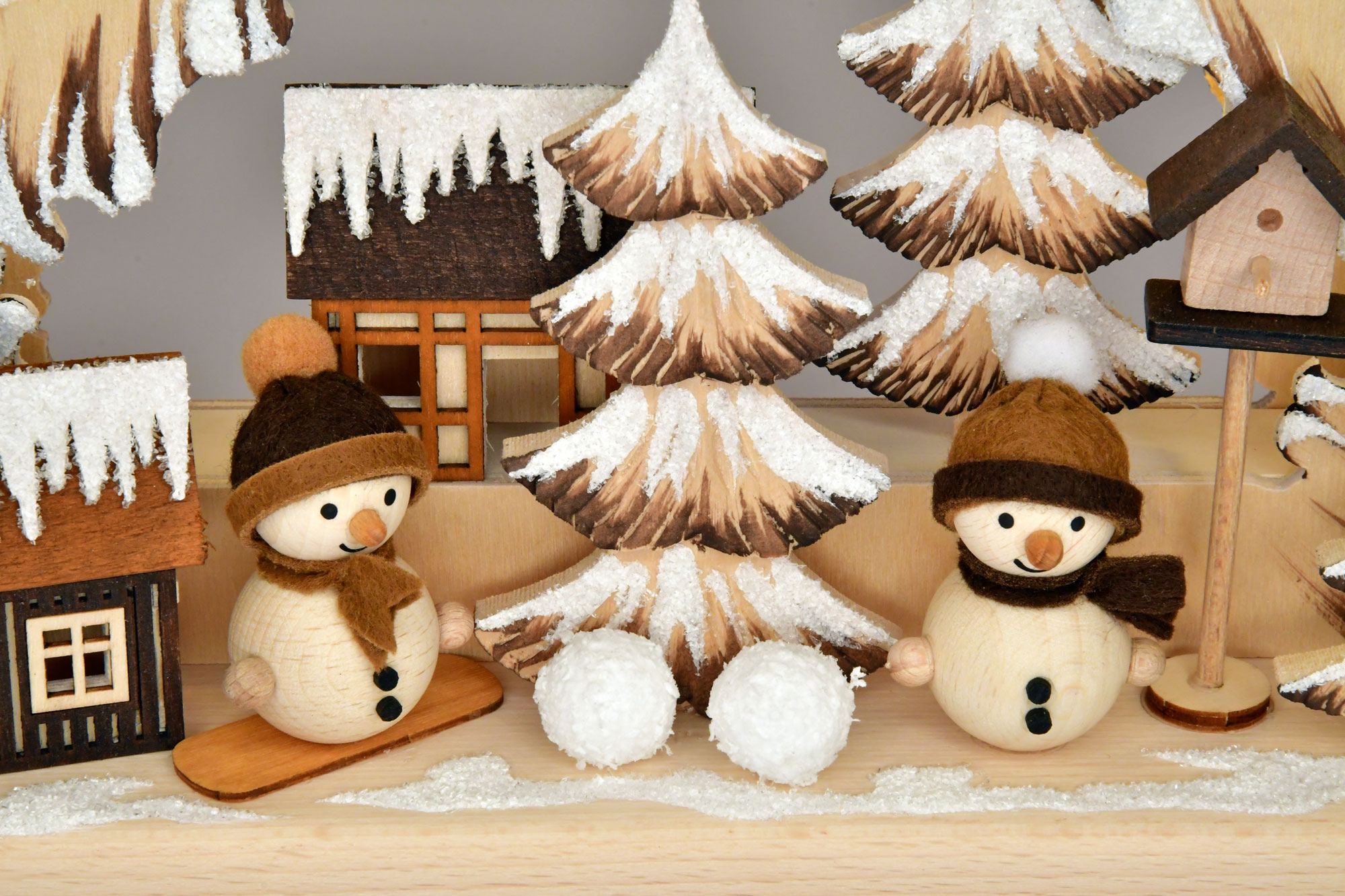 Im zauberhaft verschneiten Wald liegt ein kleines gemütliches Dörfchen. Süße naturbelassene Schneemänner tummeln sich zwischen handgeschnitzten Bäumen im Schnee. Wundervolle Schneekugeln hängen von der Tanne herab. Die feine braune Handbemalung, der frostige Raureif und die indirekte LED-Beleuchtung versetzen den Betrachter ins Staunen.