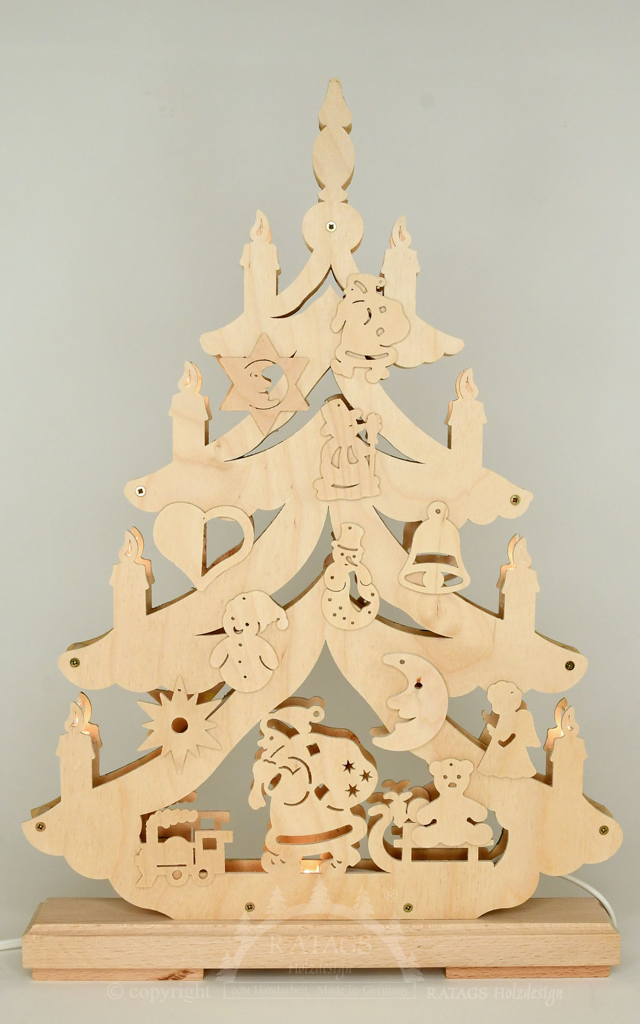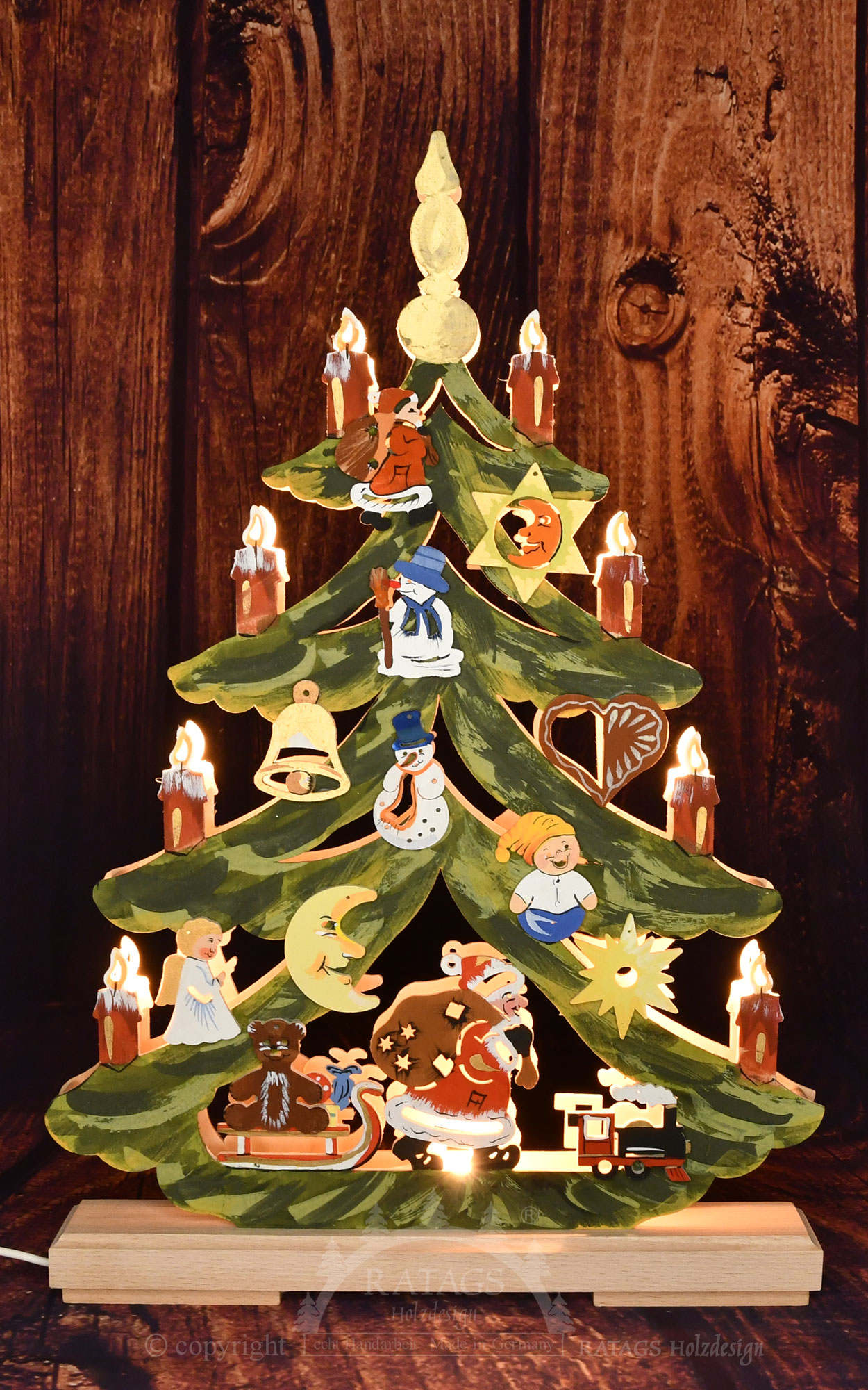 Liebevoll gestaltete kleine Tanne mit weihnachtlichen Figuren. Mit ihrer detaillierten Handbemalung ist diese Tanne ein echter Hingucker. Die indirekte, blendfreie Beleuchtung sorgt für eine stimmungsvolle Raumatmosphäre.